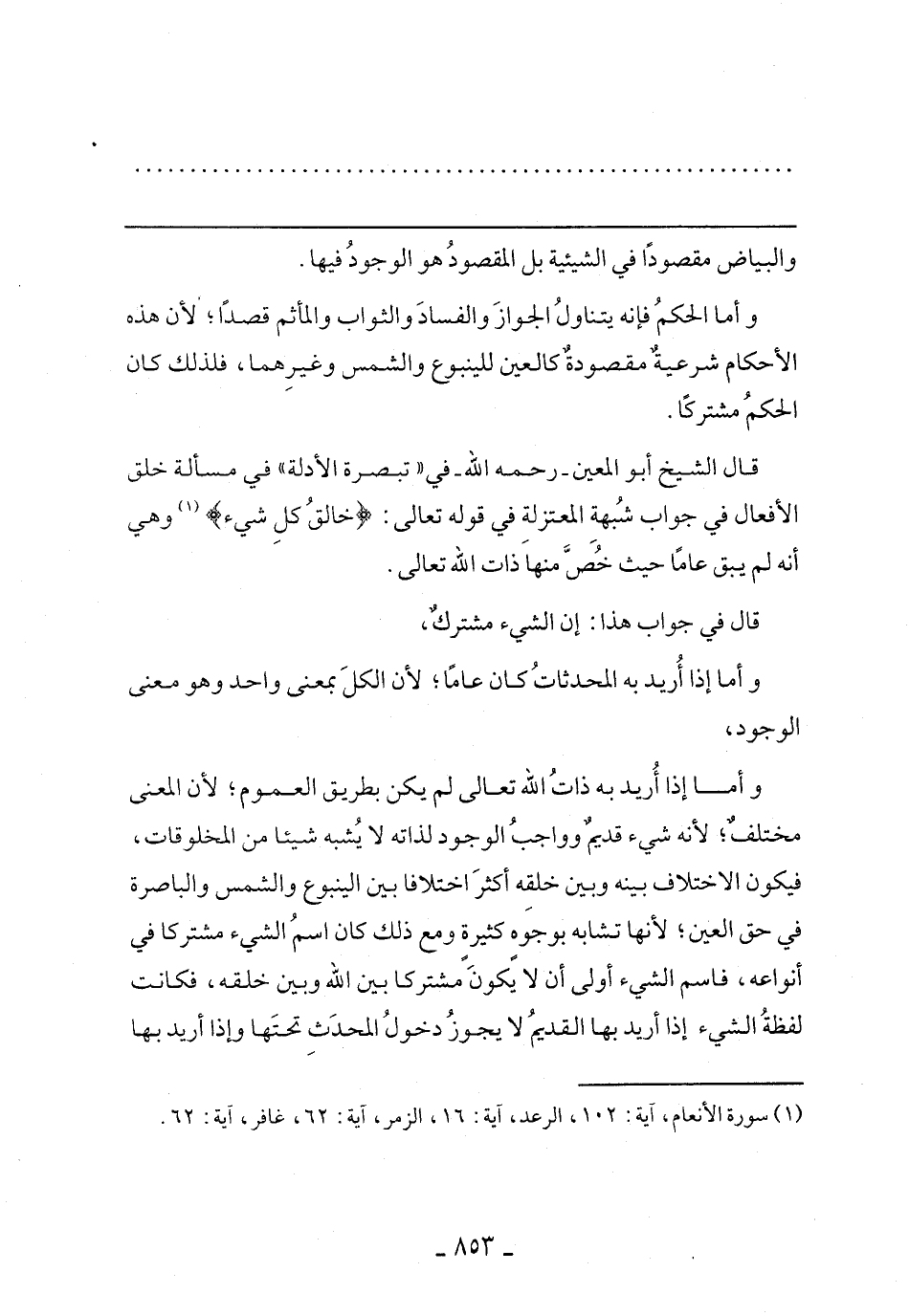 وأما إذا أريد به ذات الله تعالى لم يكن بطريق العموم؛ لأن المعنى مختلف؛ لأنه شيء قديم وواجب الوجود لذاته لا يشبه شيئا من المخلوقات، فيكون الاختلاف بينه وبين خلقه أكثر اختلافا لين الينبوع والشمس والباصرة في حق العين؛ لأنها تشابه بوجوه كثيرة ومع ذلك كان اسم الشيء مشتركا في أنواعه، فاسم الشيء أولى أن لا يكون مشتركا بين الله وبين خلقه، فكانت لفظة الشيء إذا أريد بها القديم لا يجوز دخول المحدث تحتها وإذا أريد بها