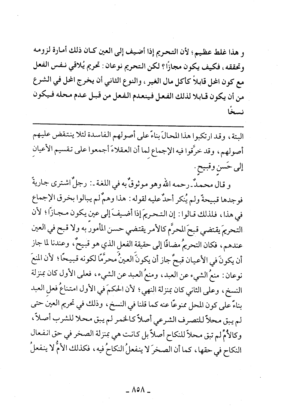 وقال محمد - رحمه الله- وهو موثوق به في اللغة: رجل اشترى جارية فوجدها قبيحة ولم ينكر أحد عليه لقوله: هذا وهم لم يبالوا بخرق الإجماع في هذا، فلذلك قالوا: إن التحريم إذا أضيف إلى عين يكون مجازا؛ لأن التحريم يقتضي قبح المحرم كالأمر يقتضي حسن المأمور به ولا قبح في العين عندهم، فكان التحريم مضافا إلى حقيقة الفعل الذي هو قبيح، وعندنا لما جاز أن يكون في الأعيان قبح جاز أن يكون العين محرما لكونه قبيحا؛ لأن المنع نوعان: منع الشيء عن العبد، ومنع العبد عن الشيء، فعلى الأولى كان بمنزلة النسخ، وعلى الثاني كان بمنزلة النهي؛ لأن الحكم في الأول امتناع فعل العبد بناء على كون المحل ممنوعا عنه كما قلنا في النسخ، وذلك في تحريم العين حتى لم يبق محلا للتصرف الشرعي أصلا كالخمر لم يبق محلا للشرب أصلا، وكالأم لم تبق محلا للنكاح أصلا بل كانت هي بمنزلة الصخر في حق انفعال النكاح في حقها، كما أن الصخر لا ينفعل النكاح فيه، فكذلك الأم لا ينفعل