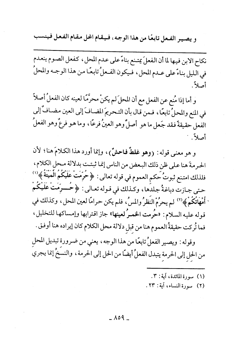 وأما إذا منع عن الفعل مع أن المحل لم يكن محرما لعينه كان الفعل أصلا في المنع والمحل تابعا، فمن قال بأن التحريم المضاف إلى العين مضاف إلى الفعل حقيقة فقد جعل ما هو أصل وهو العين فرعا، وما هو فرع وهو الفعل أصلا.