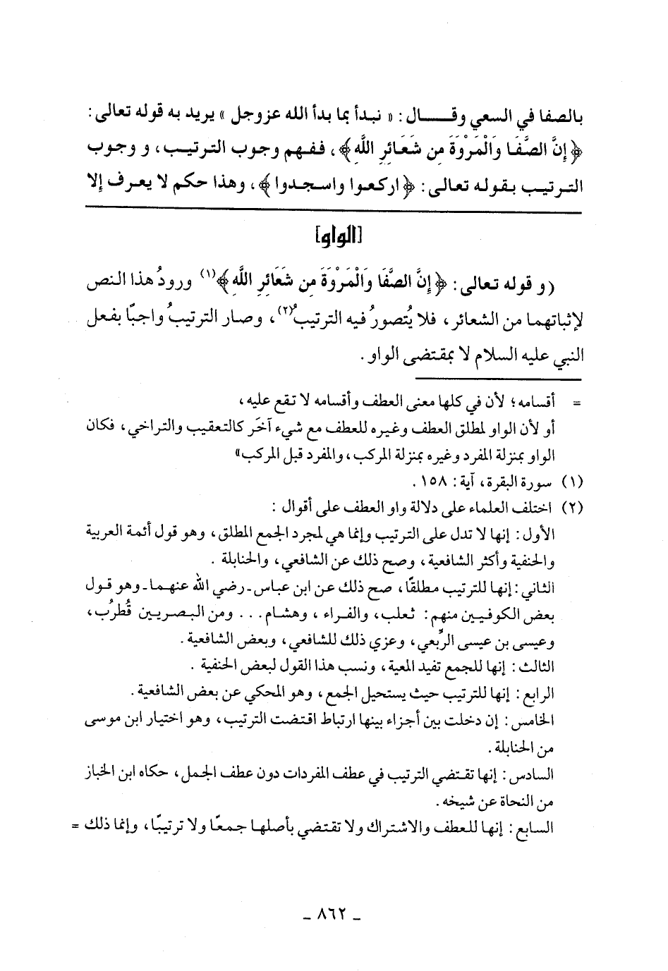 (وقوله تعالى:} إنَّ الصَّفَا والْمَرْوَةَ مِن شَعَائِرِ اللَّهِ {ورود هذا النص لإثباتهما من الشعائر، فلا يتصور فيه الترتيب، وصار الترتيب واجبا بفعل النبي عليه السلام لا بمقتضى الواو.