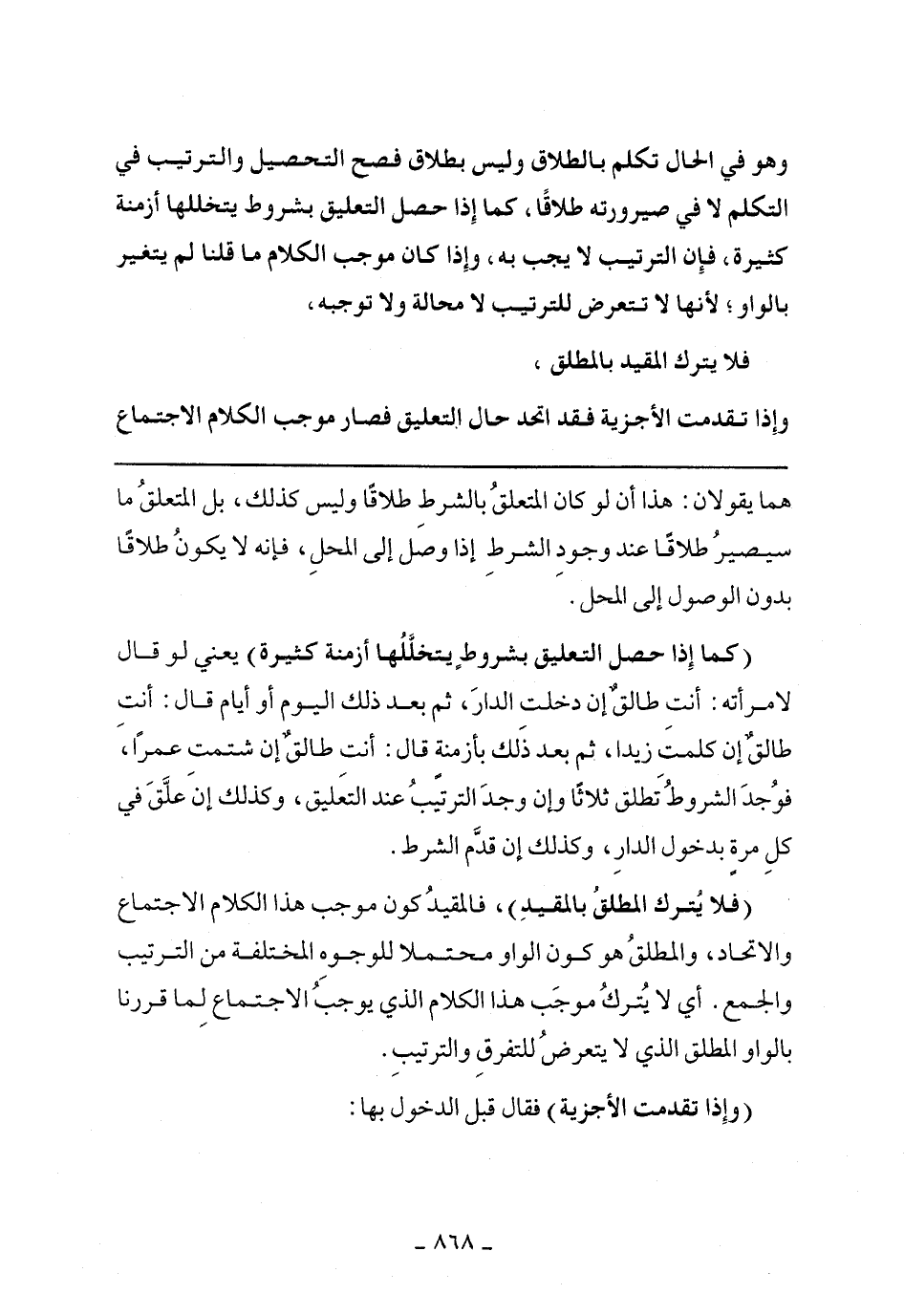 (كما إذا حصل التعليق بشروط يتخللها أزمنة كثيرة) يعني لو قال لامرأته: أنت طالق إن دخلت الدار، ثم بعد ذلك اليوم أو أيام قال: أنت طالق إن كلمت زيدا، ثم بعد ذلك بأزمنة قال: أنت طالق إن شتمت عمرا، فوجد الشروط تطلق ثلاثا وإن وجد الترتيب عند التعليق، وكذلك إن علق في كل مرة بدخول الدار، وكذلك إن قدم الشرط.