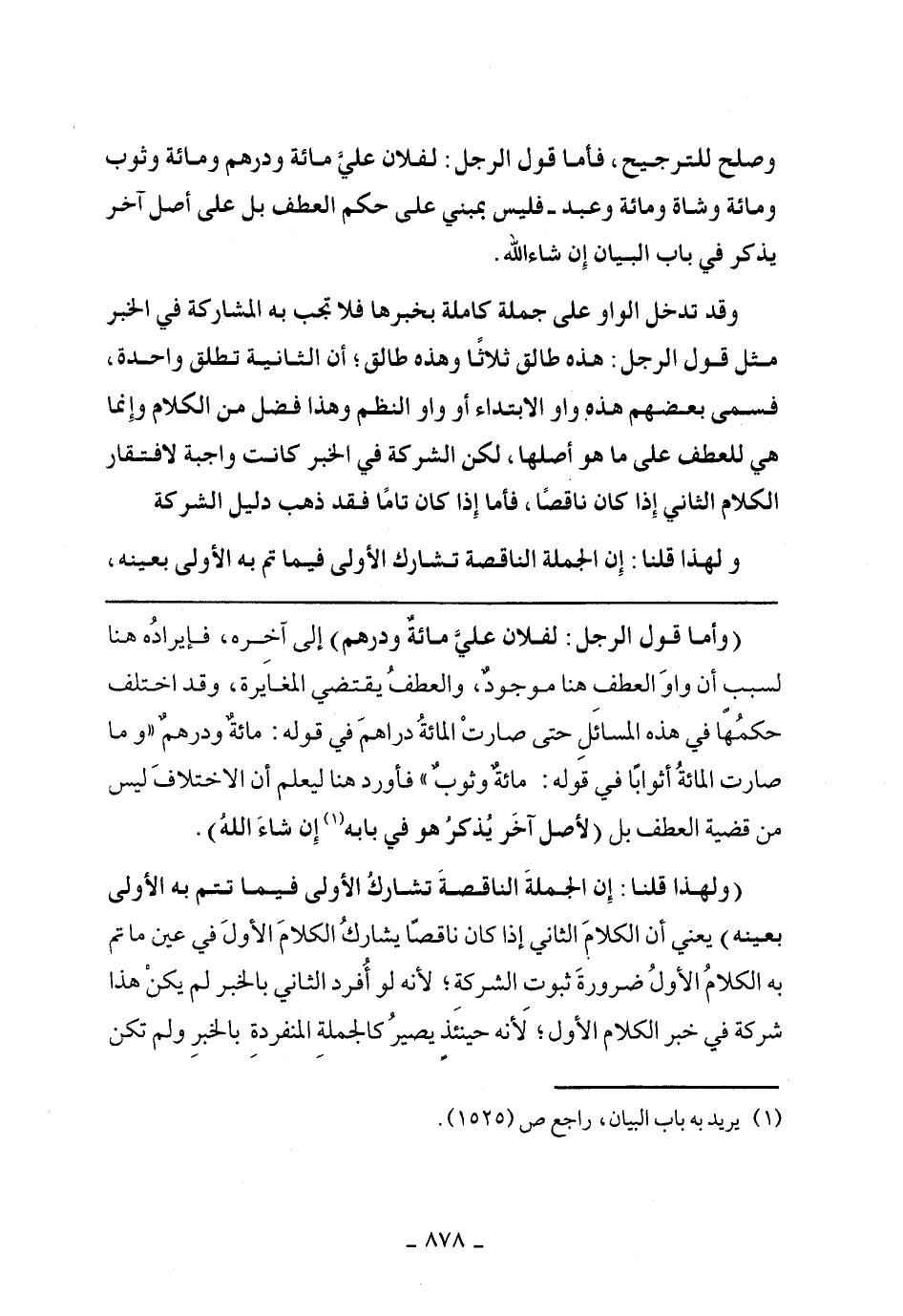 (ولهذا قلنا: إن الجملة الناقصة تشارك الأولى فيما تتم به الأولى بعينه) يعني أن الكلام الثاني إذا كان ناقصا يشارك الكلام الأول في عين ما تم به الكلام الأول ضرورة ثبوت الشركة؛ لأنه لو أفرد الثاني بالخبر لم يكن هذا شركة في خبر الكلام الأول؛ لأنه حينئذ يصير كالجملة المنفردة بالخبر ولم تكن