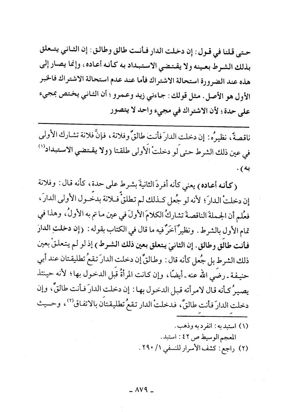 ناقصة، نظيره: إن دخلت الدار فأنت طالق وفلانة، فإن فلانة تشارك الأولى في عين ذلك الشرط حتى لو دخلت الأولى طلقتا (ولا يقتضي الاستبداد به).