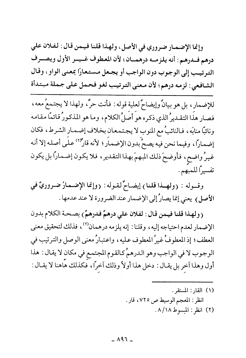 (ولهذا قلنا فيمن قال: لفلان علي درهم فدرهم) بصحة الكلام بدون الإضمار لعدم احتياجه إليه، وقلنا: إنه يلزمه درهمان، فذلك لتحقيق معنى العطف؛ إذ المعطوف غير المعطوف عليه، واعتبار معنى الوصل والترتيب في الوجوب لا في الواجب وهو الدرهم كالقوم المجتمع في مكان لا يقال: هذا أول وهذا آخر بل يقال: دخل هذا أولا وذلك آخرا، فكذلك ها هنا لا يقال: