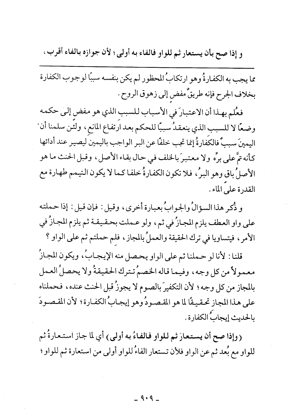 قلنا: لأنا لو حملنا ثم على الواو يحصل منه الإيجاب، ويكون المجاز معمولا من كل وجه، وفيما قاله الخصم تترك الحقيقة ولا يحصل العمل بالمجاز من كل وجه؛ لأن التكفير بالصوم لا يجوز قبل الحنث عنده، فحملناه على هذا المجاز تحقيقا لما هو المقصود وهو إيجاب الكفارة؛ لأن المقصود بالحديث إيجاب الكفارة.