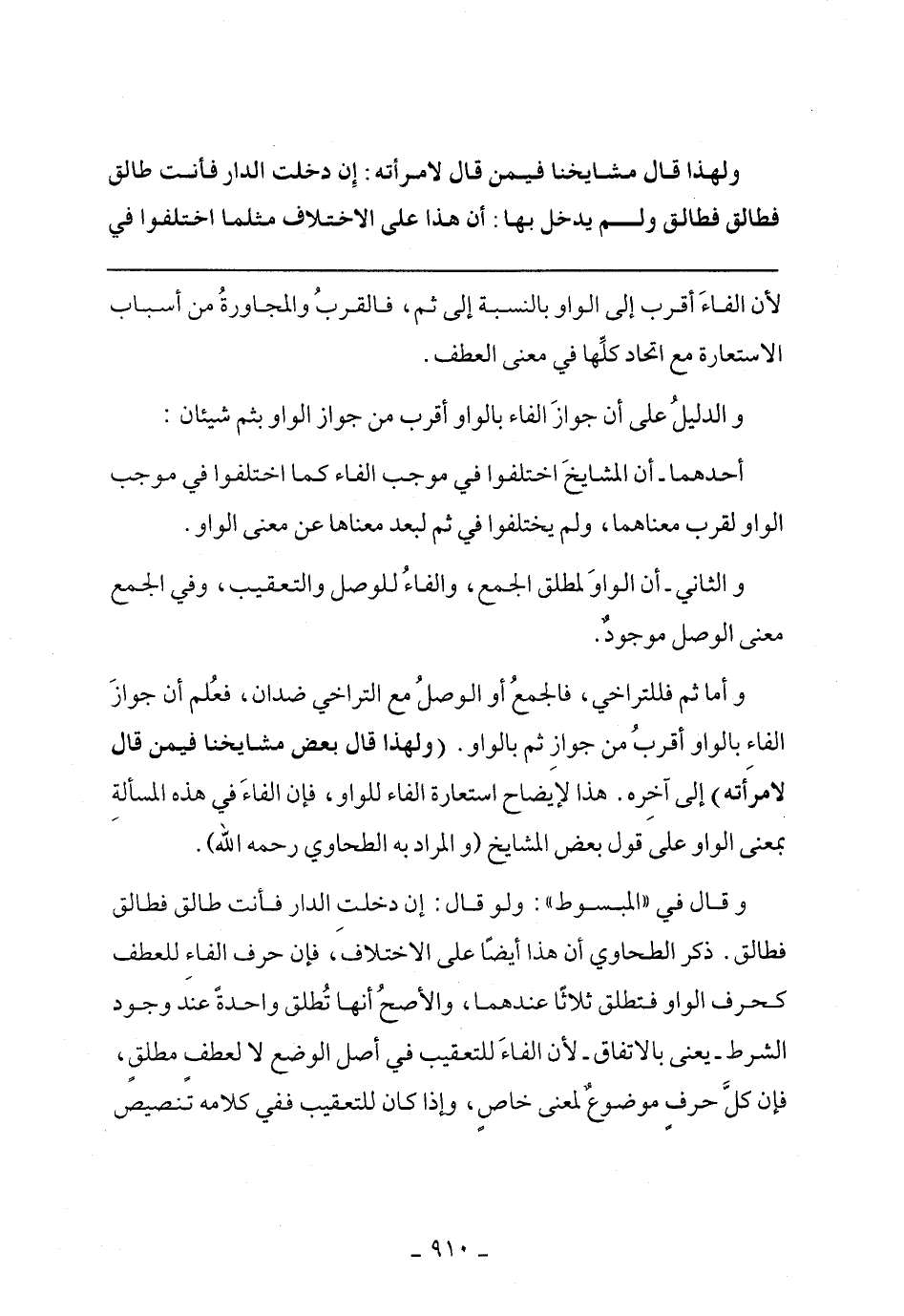 وأما ثم فللتراخي، فالجمع أو الوصل مع التراخي ضدان، فعلم أن جواز الفاء بالواو أقرب من جواز ثم بالواو. (ولهذا قال بعض مشايخنا فيمن قال لامرأته) إلى آخره. هذا لإيضاح استعارة الفاء للواو، فإن الفاء في هذه المسألة بمعنى الواو على قول بعض المشايخ (والمراد به الطحاوي رحمه الله).