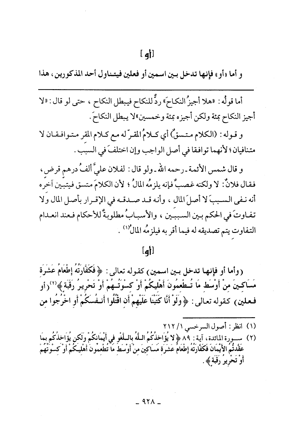 (وأما أو فإنها تدخل بين اسمين) كقوله تعالى:} فَكَفَّارَتُهُ إطْعَامُ عَشَرَةِ مَسَاكِينَ مِنْ أَوْسَطِ مَا تُطْعِمُونَ أَهْلِيكُمْ أَوْ كِسْوَتُهُمْ أَوْ تَحْرِيرُ رَقَبَةٍ فَمَن {(أو فعلين) كقوله تعالى:} ولَوْ أَنَّا كَتَبْنَا عَلَيْهِمْ أَنِ اقْتُلُوا أَنفُسَكُمْ أَوِ اخْرُجُوا مِن
