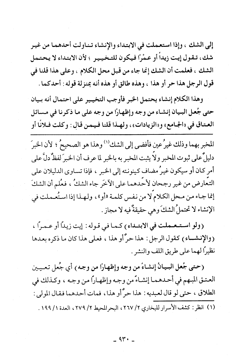 المخبر بهما وذلك غير عين فأفضى إلى الشك وهذا هو الصحيح؛ لأن الخبر دليل على ثبوت المخبر ولا يثبت لمخبر به بالخبر لما عرف أن الخبر لفظ دل على أمر كان أو سيكون غير مضاف كينونته إلى الخبر، فإذا تساوى الدليلان على التعارض من غير رجحان لأحدهما على الآخر جاء الشك، فعلم أن الشك إنما جاء من محل الكلام لا من نفس كلمة "أو"، ولهذا إذا استعملت في الإنشاء لا تحتمل الشك وهي حقيقة فيه لا مجاز.