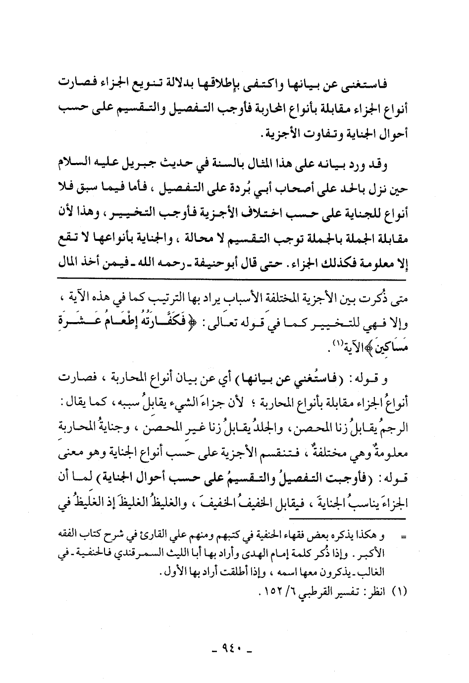 وقوله: (فاستغنى عن بيانها) أي عن بيان أنواع المحاربة، فصارت أنواع الجزاء مقابلة بأنواع المحاربة؛ لأن جزاء الشيء يقابل سببه، كما يقال: الرجم يقابل زنا المحصن، والجلد يقابل زنا غير المحصن، وجناية المحاربة معلومة وهي مختلفة، فتنقسم الأجزية على حسب أنواع الجناية وهو معنى قوله: (فأوجبت التفصيل والتقسيم على حسب أحوال الجناية) لما أن الجزاء يناسب الجناية، فيقابل الخفيف الخفيف، والغليظ الغليظ إذ الغليظ في