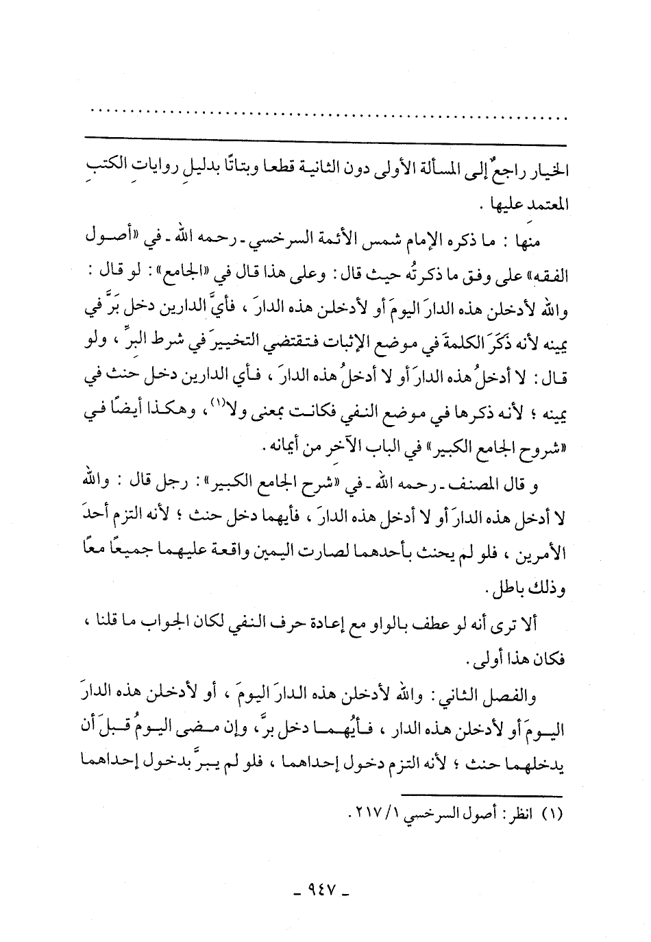 منها: ما ذكره الإمام شمس الأئمة السرخسي- رحمه الله- في "أصول الفقه" على وفق ما ذكرته حيث قال: وعلى هذا قال في "الجامع": لو قال: والله لأدخلن هذه الدار اليوم أو لأدخلن هذه الدار، فأي الدارين دخل بر في يمينه لأنه ذكر الكلمة في موضع الإثبات فتقتضي التخيير في شرط البر، ولو قال: لا أدخل هذه الدار أو لا أدخل هذه الدار، فأي الدارين دخل حنث في يمينه؛ لأنه ذكرها في موضع النفي فكانت بمعنى ولا، وهكذا أيضا في "شروح الجامع الكبير" في الباب الآخر من أيمانه.