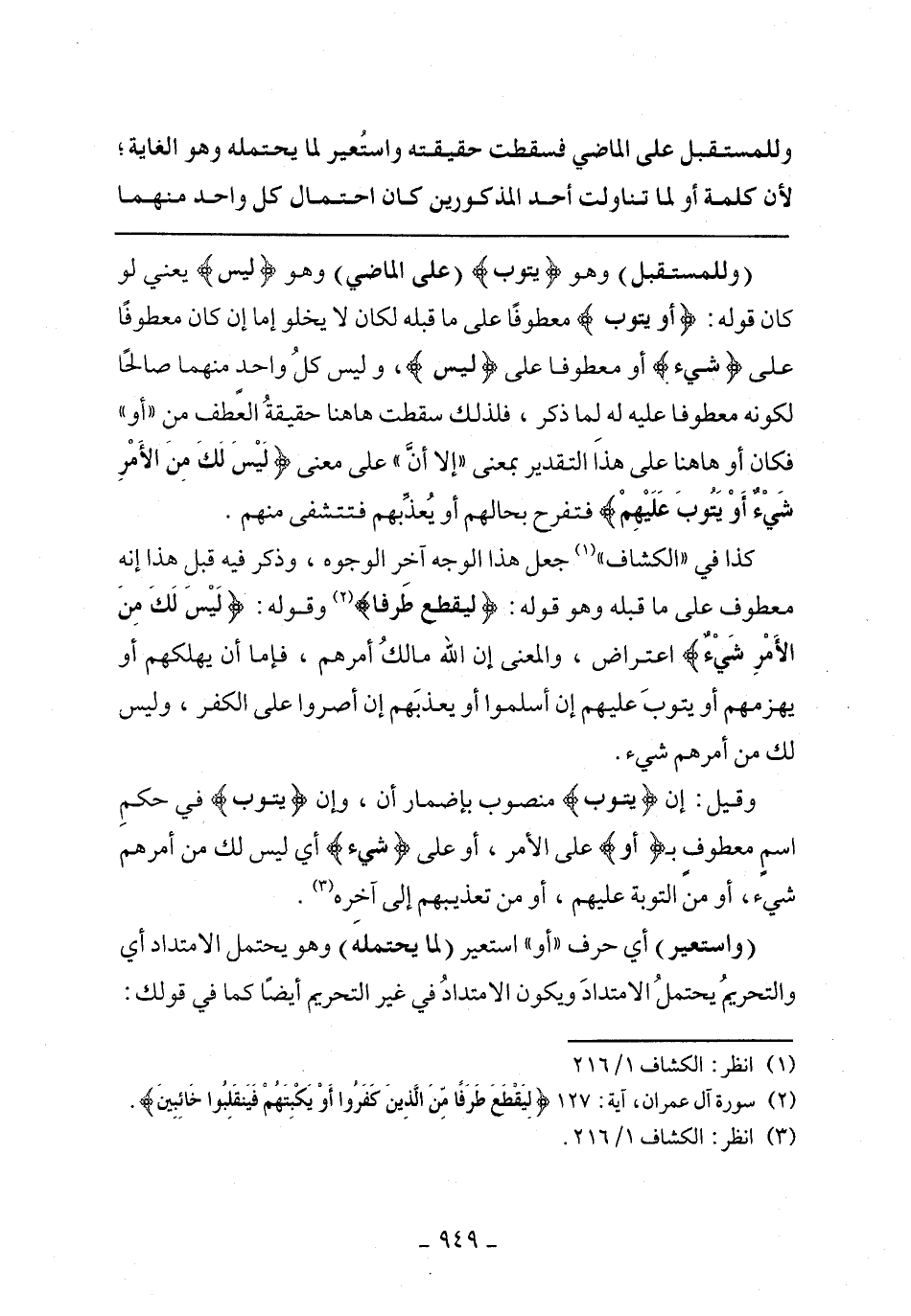 (وللمستقبل) وهو} يَتُوبَ {(على الماضي) وهو} لَيْسَ {يعني لو كان قوله:} أَوْ يَتُوبَ {معطوفا على ما قبله لكان لا يخلو إما إن كان معطوفا على} شَيْءٌ {أو معطوفا على} لَيْسَ {، وليس كل واحد منهما صالحا لكونه معطوفا عليه له لما ذكر، فلذلك سقطت ها هنا حقيقة العطف من "أو" فكان أو ها هنا على هذا التقدير بمعنى "إلا أن" على معنى} لَيْسَ لَكَ مِنَ الأَمْرِ شَيْءٌ أَوْ يَتُوبَ عَلَيْهِمْ {فتفرح بحالهم أو يعذبهم فتتشفى منهم.