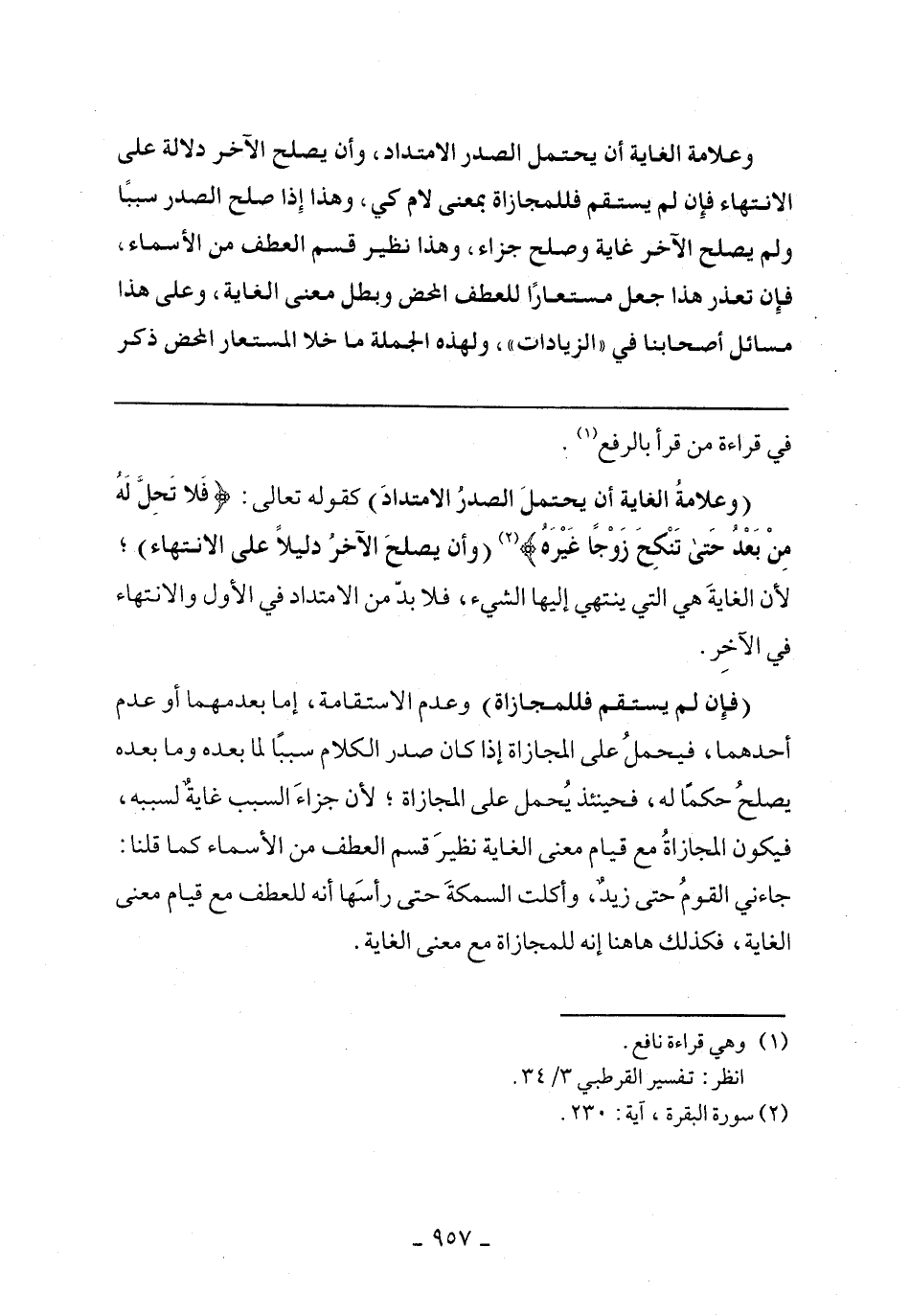 (وعلامة الغاية أن يحتمل الصدر الامتداد) كقوله تعالى:} فَلا تَحِلُّ لَهُ مِنْ بَعْدُ حَتَّى تَنكِحَ زَوْجًا غَيْرَهُ {(وأن يصلح الآخر دليلا على الانتهاء)؛ لأن الغاية هي التي ينتهي إليها الشيء، فلا بد من الامتداد في الأول والانتهاء في الآخر.