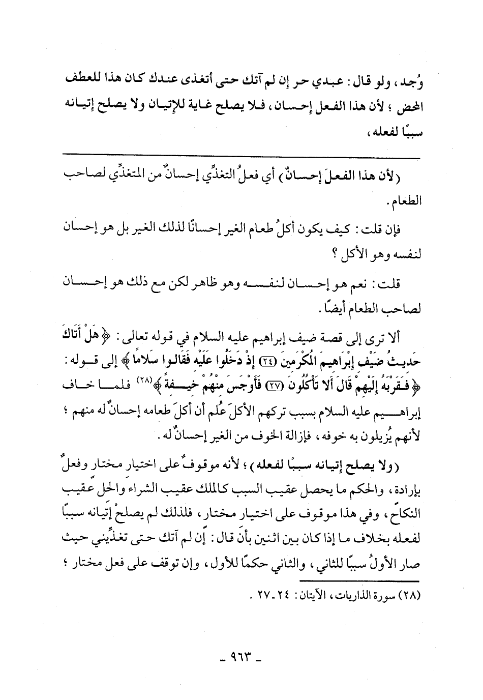 ألا ترى إلى قصة ضيف إبراهيم عليه السلام في قوله تعالى:} هل أَتَاكَ حَدِيثُ ضَيْفِ إبْرَاهِيمَ المُكْرَمِينَ (24) إذْ دَخَلُوا عَلَيْهِ فَقَالُوا سَلامًا {إلى قوله:} فَقَرَّبَهُ إلَيْهِمْ قَالَ أَلا تَاكُلُونَ (27) فَأَوْجَسَ مِنْهُمْ خِيفَةً {فلما خاف إبراهيم عليه السلام بسبب تركهم الأكل علم أن أكل طعامه إحسان له منهم؛ لأنهم يزيلون به خوفه، فإزالة الخوف من الغير إحسان له.