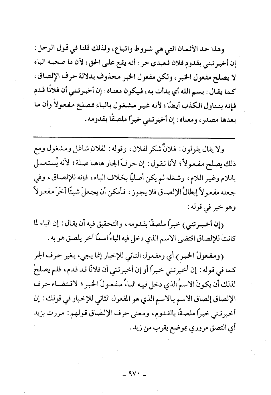 (ومفعول الخبر) أي ومفعول الثاني للإخبار إنما يجئ بغير حرف الجر كما في قوله: إن أخبرتني خبرا أو إن أخبرتني أن فلانا قد قدم، فلم يصلح لذلك أن يكون الاسم الذي دخل فيه الباء مفعول الخبر؛ لاقتضاء حرف الإلصاق إلصاق الاسم بالاسم الذي هو المفعول الثاني للإخبار في قولك: أن أخبرتني خبرا ملصقا بالقدوم، ومعنى حرف الإلصاق قولهم: مررت بزيد أي التصق مروري بموضع يقرب من زيد.