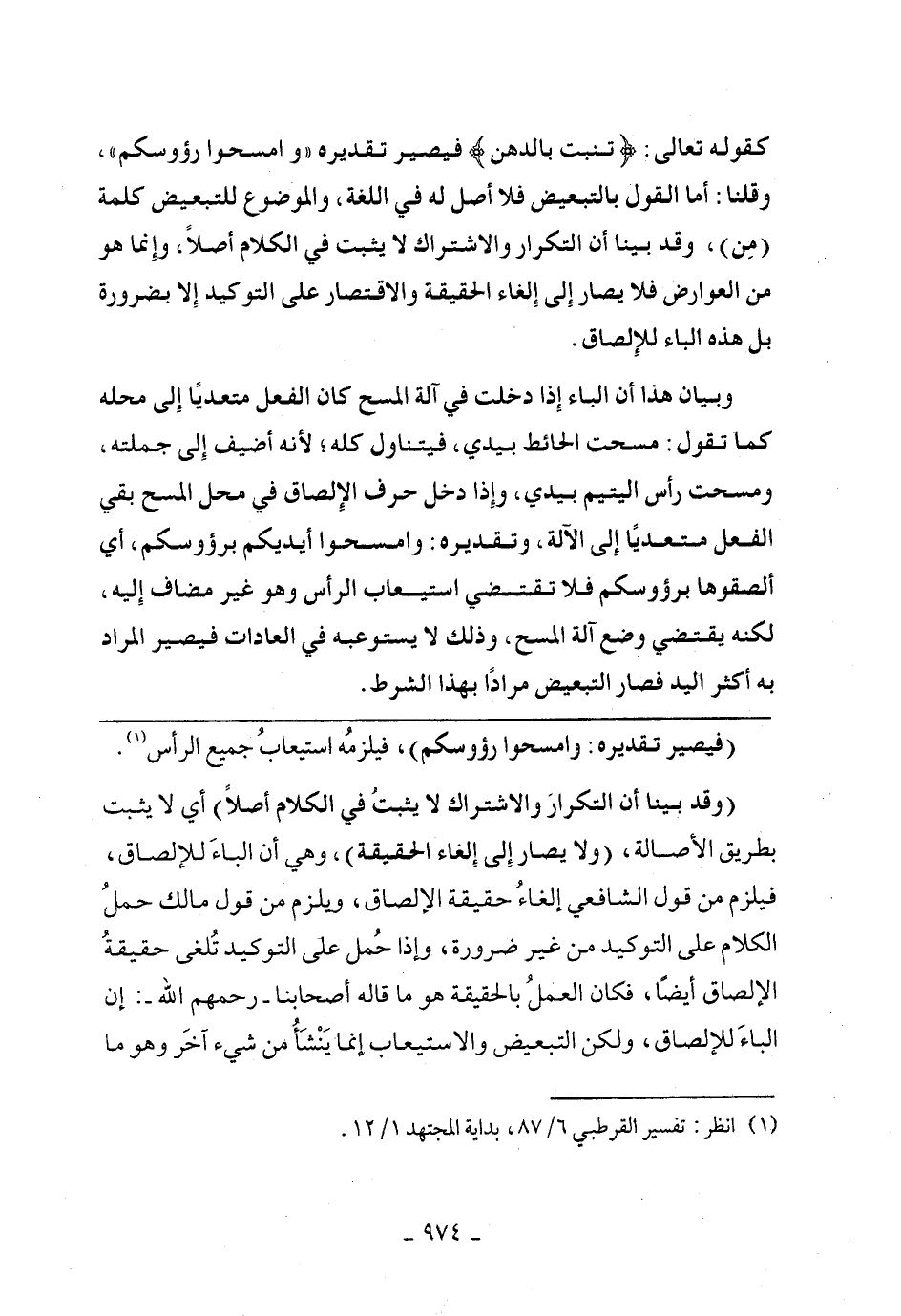 (وقد بينا أن التكرار والاشتراك لا يثبت في الكلام أصلا) أي لا يثبت بطريق الأصالة، و (لا يصار إلى إلغاء الحقيقة)، وهي أن الباء للإلصاق، فيلزم من قول الشافعي إلغاء حقيقة الإلصاق، ويلزم من قول مالك حمل الكلام على التوكيد من غير ضرورة، وإذا حمل على التوكيد تلغى حقيقة الإلصاق أيضا، فكان العمل بالحقيقة هو ما قاله أصحابنا- رحمهم الله: إن الباء للإلصاق، ولكن التبعيض والاستيعاب إنما ينشأ من شيء آخر وهو ما