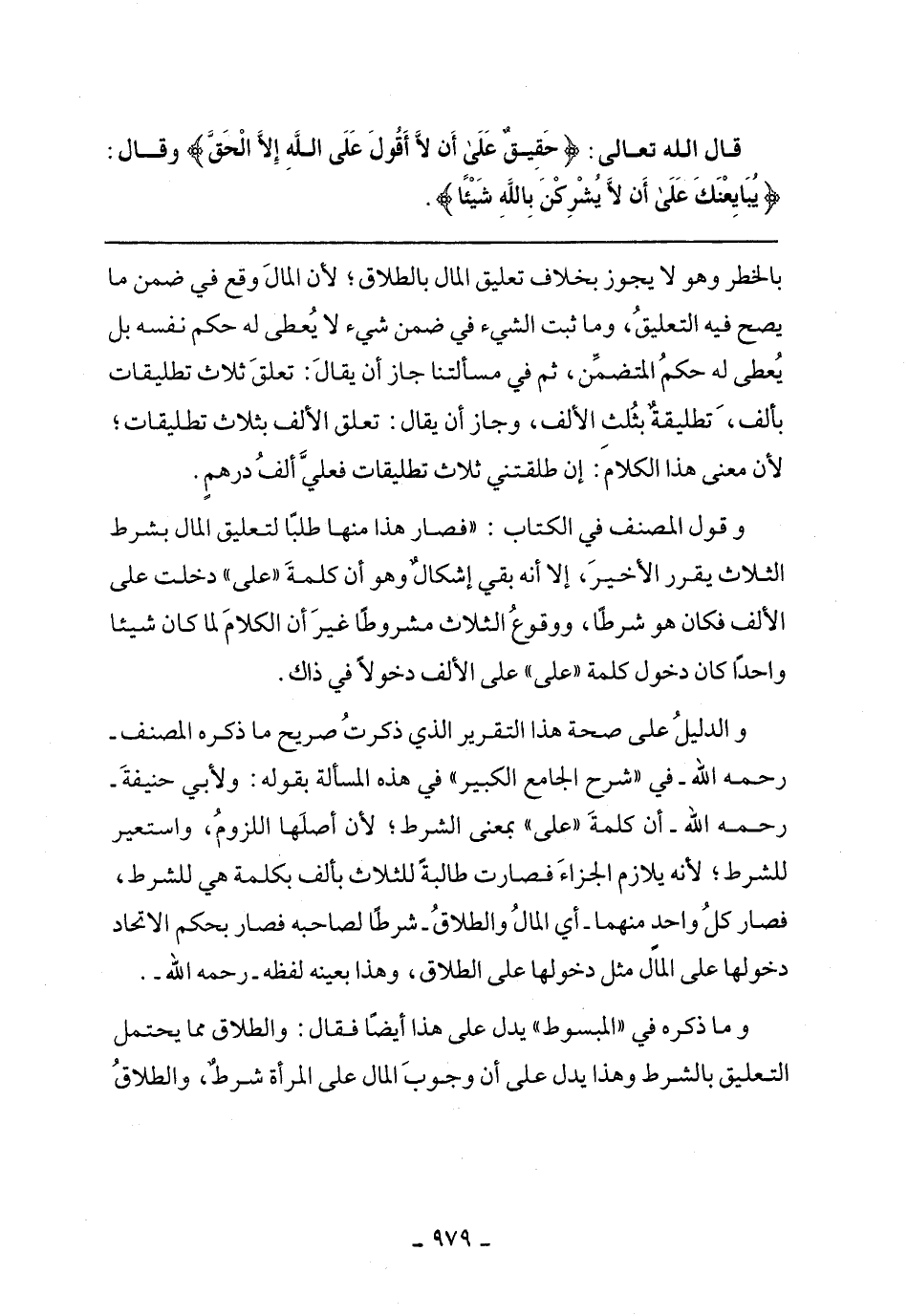 والدليل على صحة هذا التقرير الذي ذكرت صريح ما ذكره المصنف- رحمه الله- في "شرح الجامع الكبير" في هذه المسألة بقوله: ولأبي حنيفة- رحمه الله- أن كلمة "على" بمعنى الشرط؛ لأن أصلها اللزوم، واستعير للشرط؛ لأنه يلازم الجزاء فصارت طالبة للثلاث بألف كلمة هي للشرط، فصار كل واحد منهما- أي المال والطلاق- شرطا لصاحبه فصار بحكم الاتحاد دخولها على المال مثل دخولها على الطلاق، وهذا بعينه لفظه- رحمه الله.