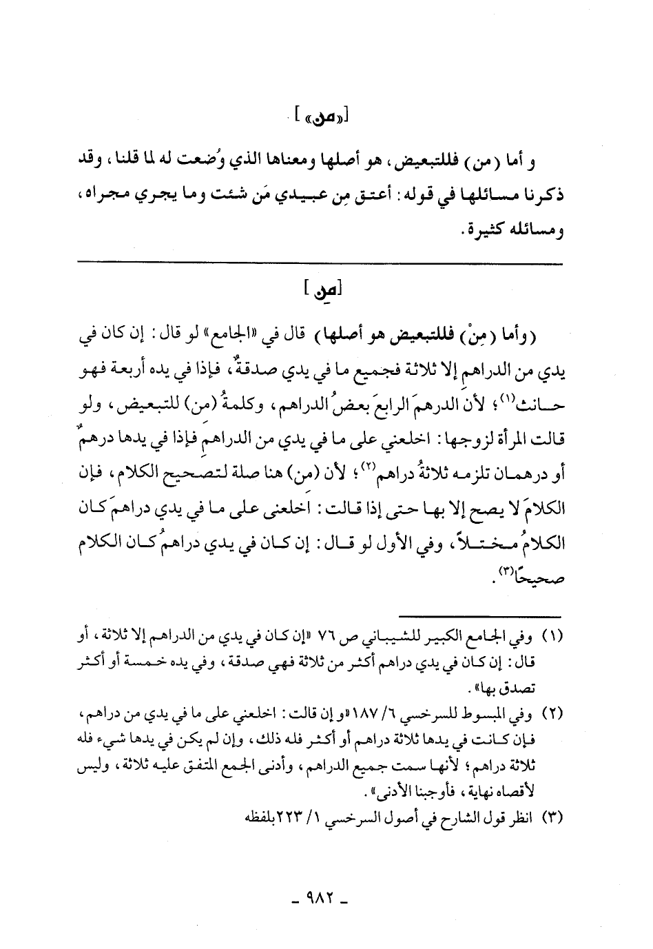 (وأما (من) فللتبعيض هو أصلها) قال في "الجامع" لو قال: إن كان في يدي من الدراهم إلا ثلاثة فجميع ما في يدي صدقة، فإذ في يده أربعة فهو حانث؛ لأن الدرهم الرابع بعض الدراهم، وكلمة (من) للتبعيض، ولو قالت المرأة لزوجها: اخلعني على ما في يدي الدراهم فإذ في يدها درهم أو درهمان تلزمه ثلاثة دراهم؛ لأن (من) هنا صلة لتصحيح الكلام، فإن الكلام لا يصح إلا بها حتى إذ قالت: اخلعني على ما في يدي دراهم كان الكلام مختلا، وفي الأول لو قال: إن كان في يدي دراهم كان الكلام صحيحاً.