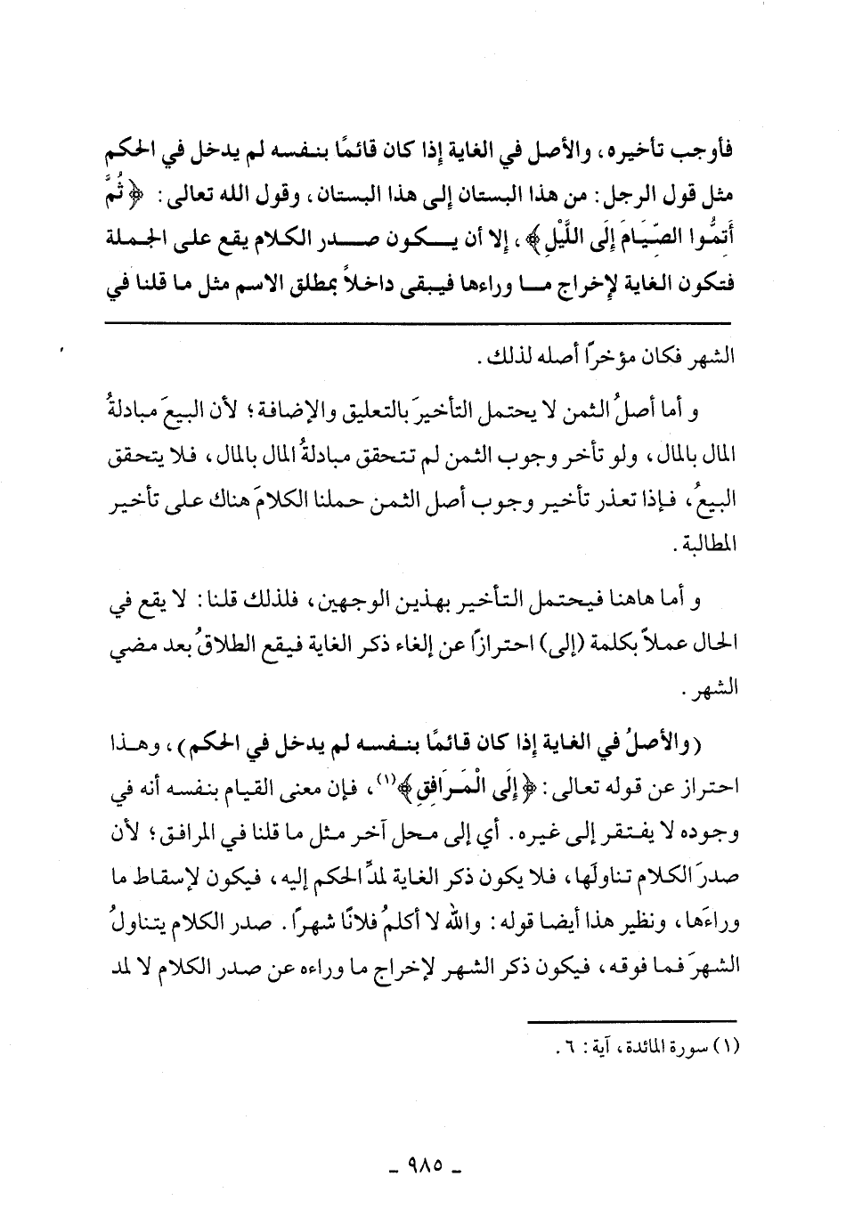 (والأصل في الغاية إذا كان قائما بنفسه لم يدخل في الحكم)، وهذا احتراز عن قوله تعالى:} إلَى المَرَافِقِ {، فإن معنى القيان بنفسه أنه في وجوده لا يفتقر إلى غيره. أي إلى محل آخر مثل ما قلنا في المرافق؛ لأن صدر الكلام تناولها، فلا يكون ذكر الغاية لمد الحكم إليه، فيكون لإسقاط ما وراءها، ونظير هذا أيضا قوله: والله لا أكلم فلانا شهرا. صدر الكلام يتناول الشهر فما فوقه، فيكون ذكر الشهر لإخراج ما وراءه عن صدر الكلام لا لمد