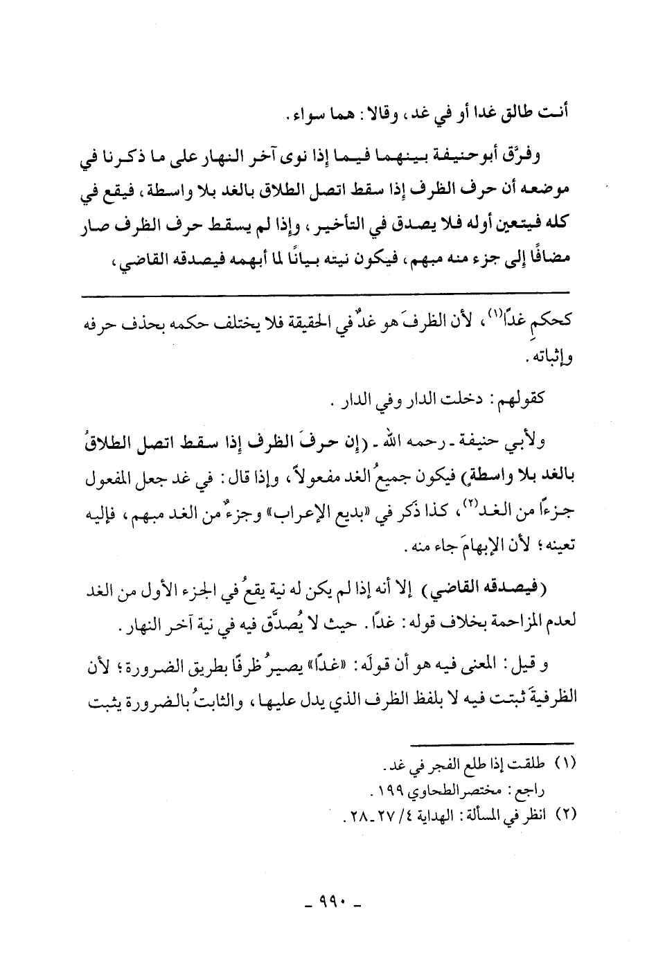ولأبي حنيفة- رحمه الله- (إن حرف الظرف إذا سقط اتصل الطلاق بالغد بلا واسطة) فيكون جميع الغد مفعولا، وإذا قال: في غد جعل المفعول جزءا من الغد، كذا ذكر في "بديع الإعراب" وجزء من الغد مبهم، فإليه تعينه؛ لأن الإبهام جاء منه.