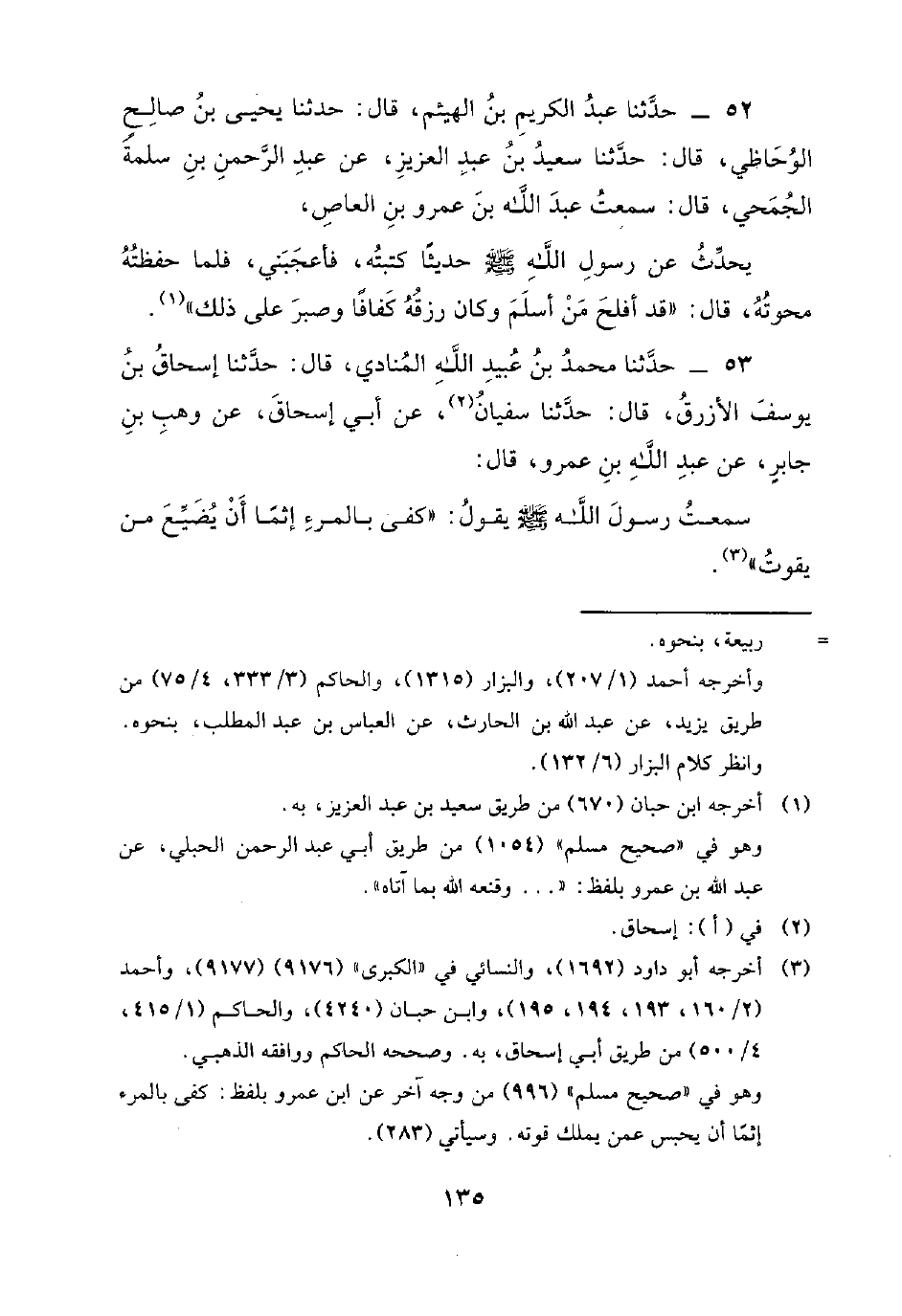 53 - حَدَّثَنَا مُحَمَّدُ بْنُ عُبَيْدِ اللَّهِ الْمُنَادِي، قَالَ: حَدَّثَنَا إِسْحَاقُ بْنُ يُوسُفَ الأَزْرَقُ، قَالَ: حَدَّثَنَا سُفْيَانُ، عَنْ أَبِي إِسْحَاقَ، عَنْ وَهْبِ بْنِ جَابِرٍ، عَنْ عَبْدِ اللَّهِ بْنِ عَمْرٍو، قَالَ: سَمِعْتُ رَسُولَ اللَّهِ صَلَّى اللَّهُ عَلَيْهِ وَسَلَّمَ يقول: كفى بالمرء إثما أن يضيع من يقوت