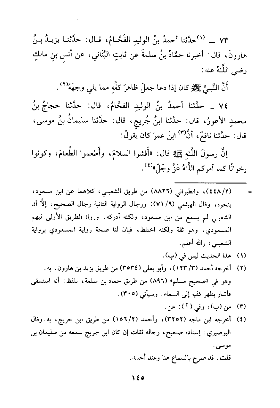 74 - حَدَّثَنَا أَحْمَدُ بْنُ الْوَلِيدِ الْفَحَّامُ، قَالَ: حَدَّثَنَا حَجَّاجُ بْنُ مُحَمَّدٍ الأَعْوَرُ، قَالَ: حَدَّثَنَا ابْنُ جُرَيْجٍ، قَالَ: حَدَّثَنَا سُلَيْمَانُ بْنُ مُوسَى، قَالَ: حَدَّثَنَا نَافِعٌ، أن ابن عمر كَانَ يَقُولُ: أن رسول الله صلى الله عليه وسلم قَالَ: أَفْشُوا السَّلامَ، وَأَطْعِمُوا الطَّعَامَ، وَكُونُوا إِخْوَانًا كَمَا أَمَرَكُمُ اللَّهُ عَزَّ وَجَلَّ.
