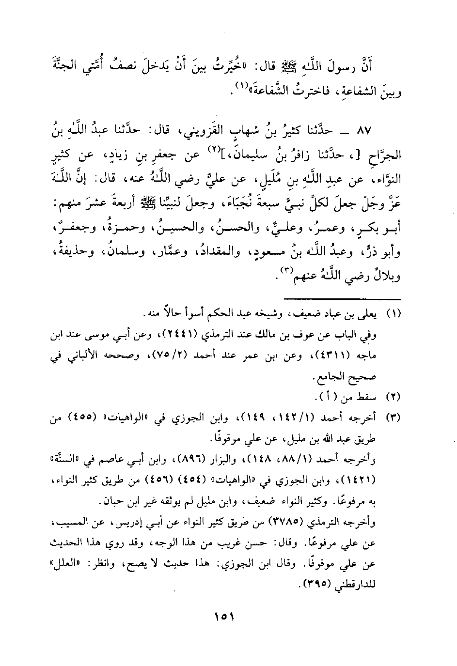 87 - حَدَّثَنَا كَثِيرُ بْنُ شِهَابٍ الْقَزْوِينِيُّ، قَالَ: حَدَّثَنَا عَبْدُ اللَّهِ بْنُ الْجَرَّاحِ، حَدَّثَنَا زَافِرُ بْنُ سُلَيْمَانَ، عَنْ جَعْفَرِ بْنِ زِيَادٍ، عَنْ كَثِيرٍ النَّوَّاءِ، عَنْ عَبْدِ اللَّهِ بْنِ مَلِيلٍ، عَنْ عَلِيٍّ رَضِيَ اللَّهُ عَنْهُ، قَالَ: إِنَّ اللَّهَ عَزَّ وَجَلَّ جَعَلَ لِكُلِّ نَبِيٍّ سَبْعَةَ نُجَبَاءَ، وَجَعَلَ لِنَبِيِّنَا صَلَّى اللَّهُ عَلَيْهِ وَسَلَّمَ أَرْبَعَةَ عَشَرَ مِنْهُمْ: أَبُو بَكْرٍ، وَعُمَرُ، وَعَلِيٌّ، وَالْحَسَنُ، وَالْحُسَيْنُ، وَحَمْزَةُ، وَجَعْفَرٌ، وَأَبُو ذَرٍّ، وَعَبْدُ اللَّهِ بْنُ مَسْعُودٍ، وَالْمِقْدَادُ، وَعَمَّارُ، وَسَلْمَانُ، وَحُذَيْفَةُ، وَبِلالٌ رَضِيَ اللَّهُ عنهم.