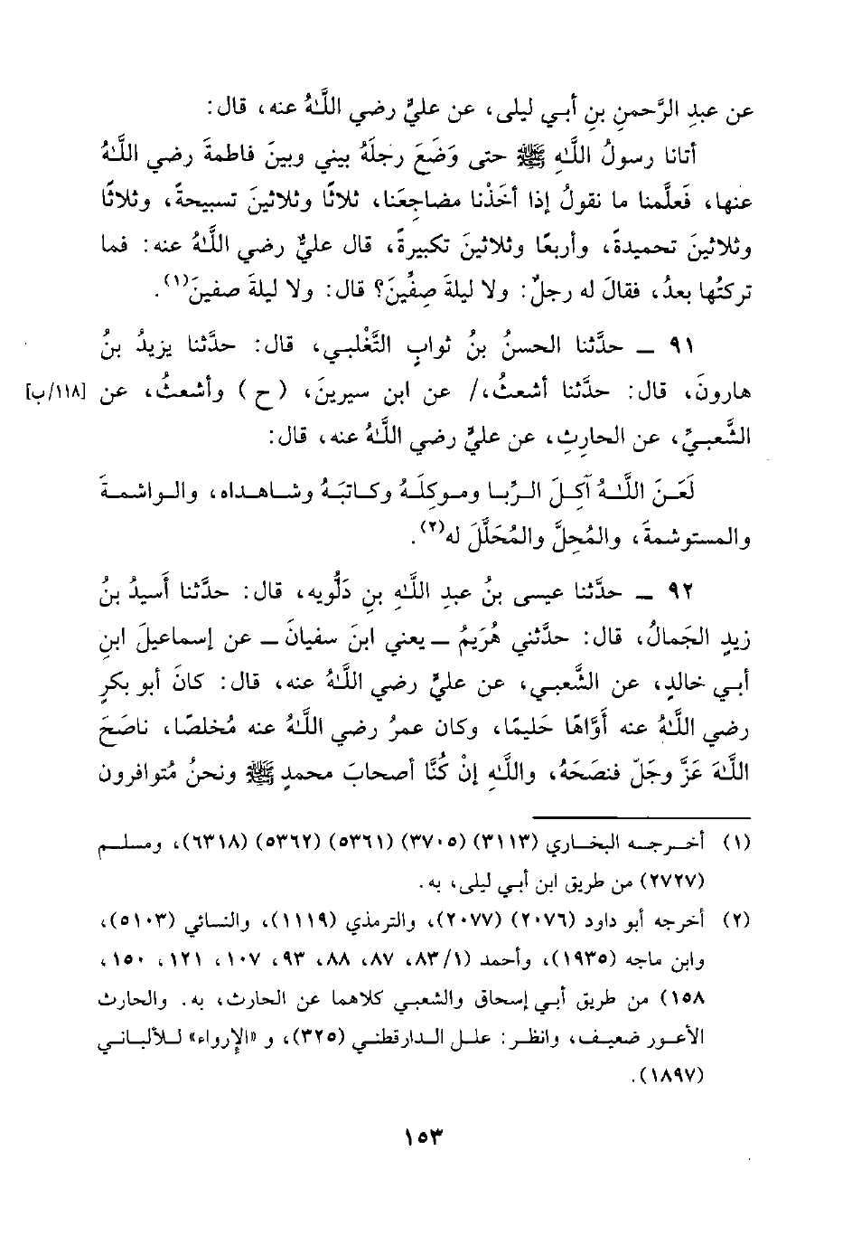 91 - حَدَّثَنَا الْحَسَنُ بْنُ ثَوَابٍ التَّغْلِبِيُّ، قَالَ: حَدَّثَنَا يَزِيدُ بْنُ هَارُونَ، قَالَ: حَدَّثَنَا أَشْعَثُ، / عَنِ ابْنِ سِيرِينَ، (ح) وَأَشْعَثُ، عَنِ الشَّعْبِيِّ، عَنِ الْحَارِثِ، عَنْ عَلِيٍّ رَضِيَ اللَّهُ عَنْهُ، قَالَ: لَعَنَ اللَّهُ آكل الربا وموكله وكاتبه وشاهداه، والواشمة والمستوشمة، والمحل وَالْمُحَلَّلَ لَهُ.
