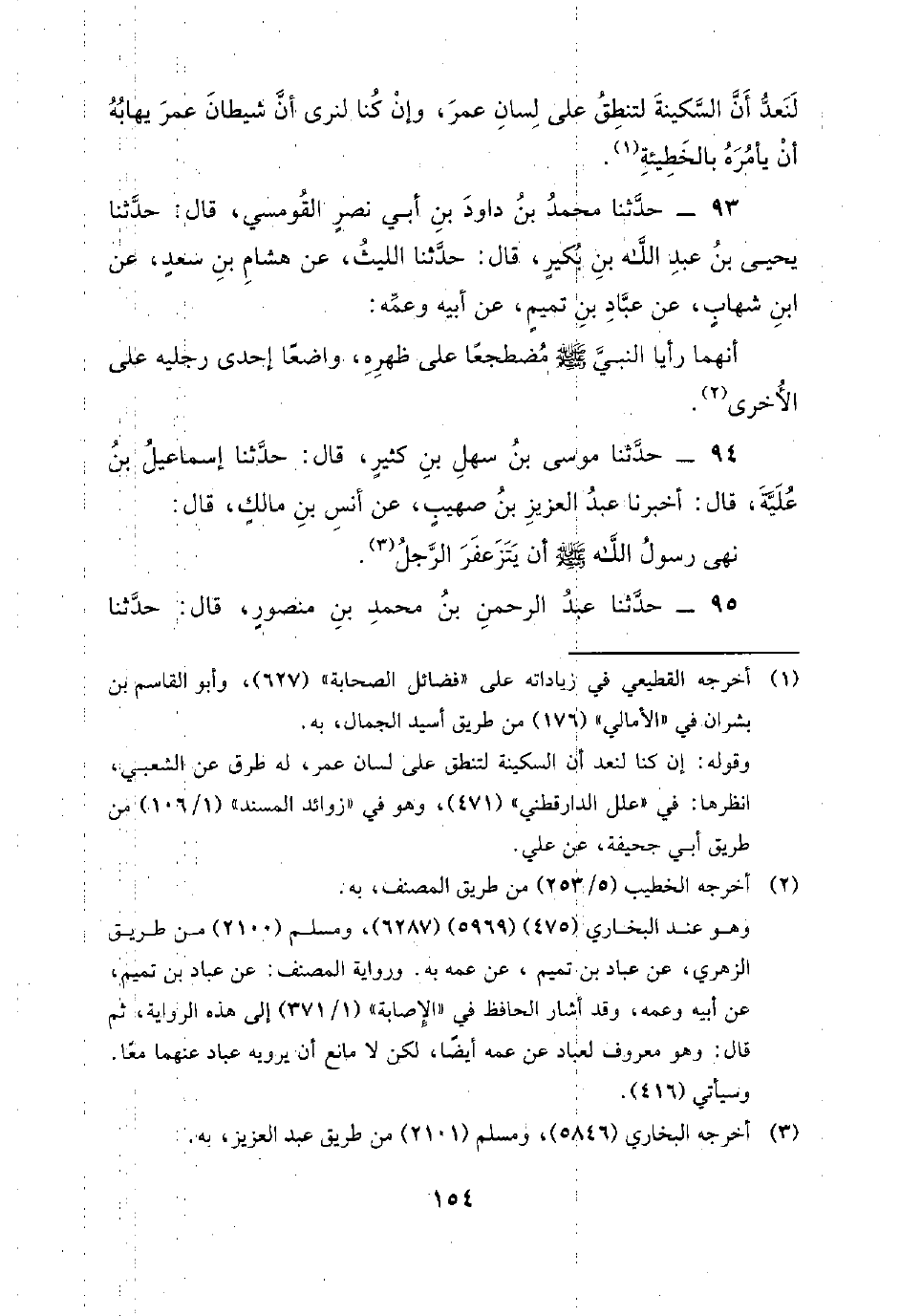 93 - حَدَّثَنَا مُحَمَّدُ بْنُ دَاوُدَ بْنِ أَبِي نَصْرٍ الْقَوْمَسِيُّ، قَالَ: حَدَّثَنَا يَحْيَى بْنُ عَبْدِ اللَّهِ بن بكير، قال: حدثني اللَّيْثُ، عَنْ هِشَامِ بْنِ سَعْدٍ، عَنِ ابْنِ شِهَابٍ، عَنْ عَبَّادِ بْنِ تَمِيمٍ، عَنْ أَبِيهِ وَعَمِّهِ: أَنَّهُمَا رَأَيَا النَّبِيَّ صَلَّى اللَّهُ عَلَيْهِ وَسَلَّمَ مُضْطَجِعًا عَلَى ظَهْرِهِ، وَاضِعًا إِحْدَى رِجْلَيْهِ على الأخرى.