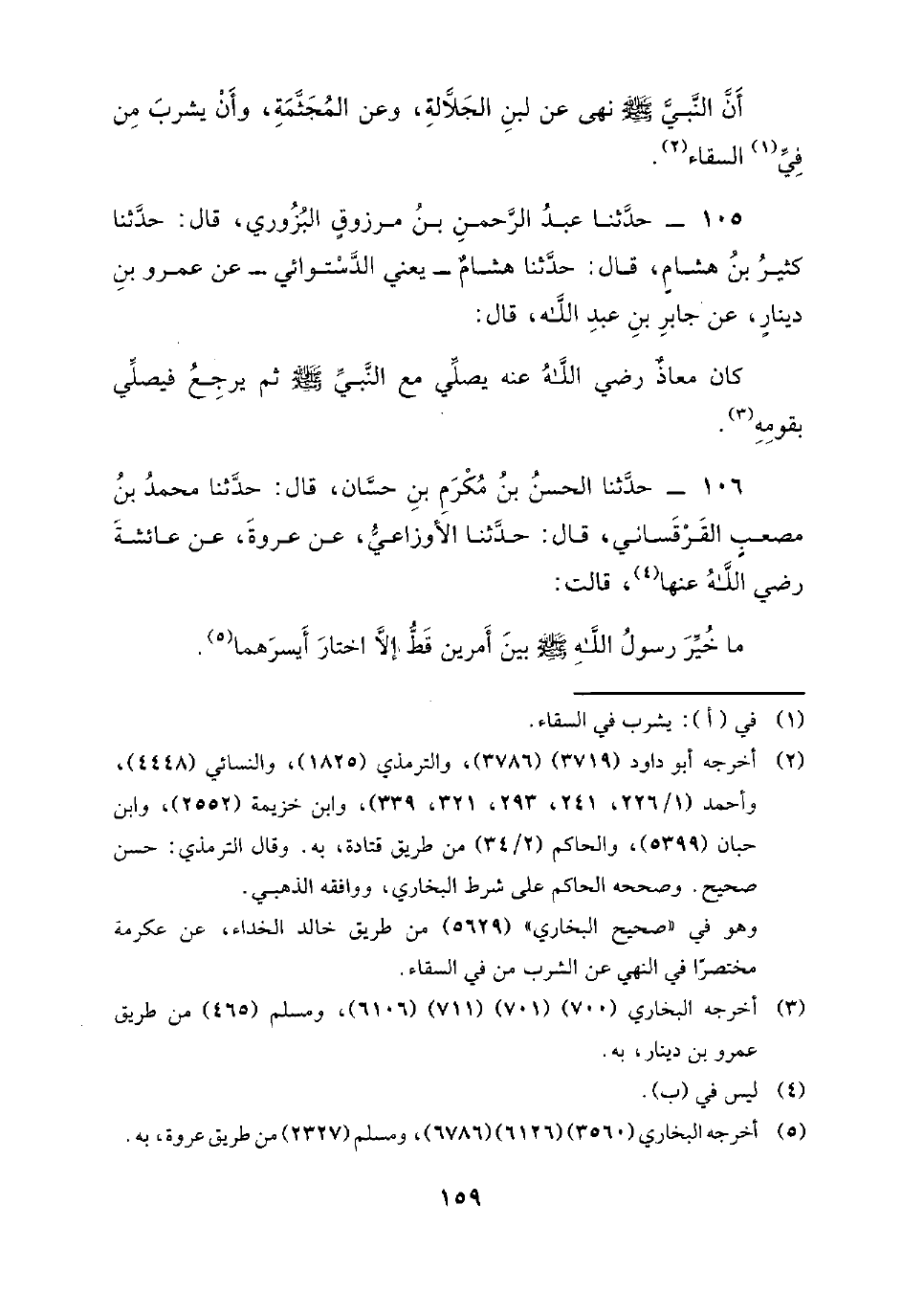 106 - حَدَّثَنَا الْحَسَنُ بْنُ مُكْرَمِ بْنِ حَسَّانَ، قَالَ: حَدَّثَنَا مُحَمَّدُ بْنُ مُصْعَبٍ الْقُرْقُسَانِيُّ، قَالَ: حَدَّثَنَا الأَوْزَاعِيُّ، عَنْ عُرْوَةَ، عَنْ عَائِشَةَ رَضِيَ اللَّهُ عَنْهَا، قَالَتْ: مَا خُيِّرَ رَسُولُ اللَّهِ صَلَّى اللَّهُ عَلَيْهِ وَسَلَّمَ بَيْنَ أَمْرَيْنِ قَطُّ إِلا اختار أيسرهما.