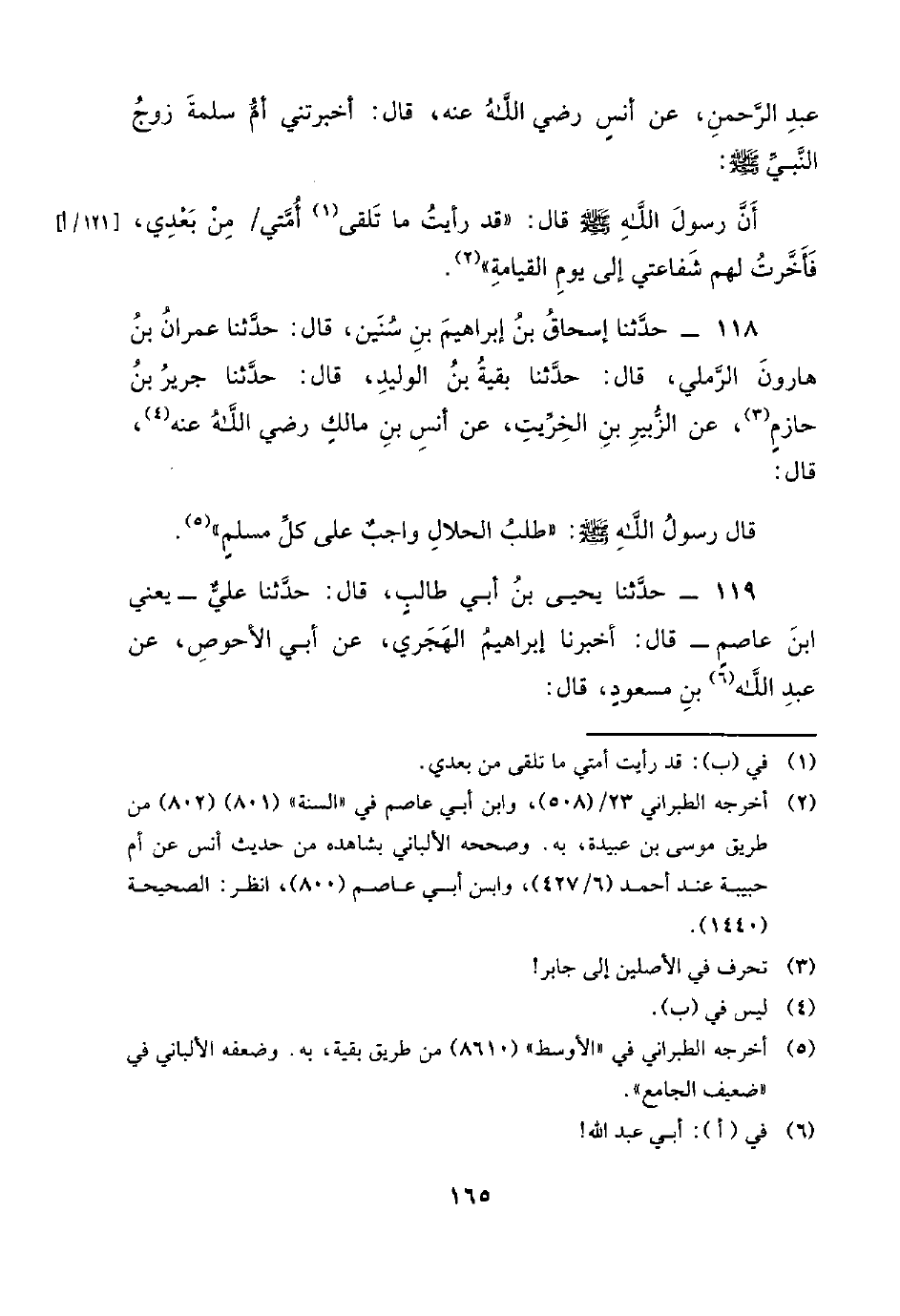 118 - حَدَّثَنَا إِسْحَاقُ بْنُ إِبْرَاهِيمَ بْنِ سِنِينَ، قَالَ: حَدَّثَنَا عِمْرَانُ بْنُ هَارُونَ الرَّمَلِيُّ، قَالَ: حَدَّثَنَا بَقِيَّةُ بْنُ الْوَلِيدِ، قَالَ: حَدَّثَنَا جَرِيرُ بْنُ حَازِمٍ، عَنِ الزُّبَيْرِ بْنِ الْخِرِّيتِ، عَنْ أَنَسِ بْنِ مَالِكٍ رَضِيَ اللَّهُ عَنْهُ، قَالَ: قَالَ رَسُولُ اللَّهِ صَلَّى اللَّهُ عَلَيْهِ وَسَلَّمَ: طَلَبُ الْحَلالِ وَاجِبٌ عَلَى كُلِّ مُسْلِمٍ