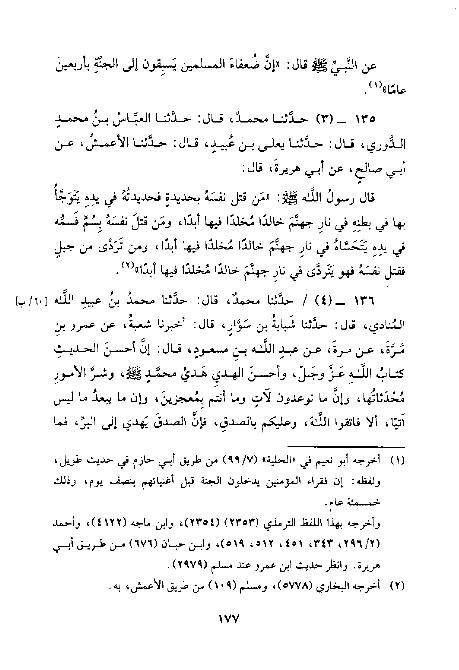 135 - (3) حدثنا محمد، قال: حدثنا العباس بن محمد الدُّورِيُّ، قَالَ: حَدَّثَنَا يَعْلَى بْنُ عُبَيْدٍ، قَالَ: حَدَّثَنَا الأَعْمَشُ، عَنْ أَبِي صَالِحٍ، عَنْ أَبِي هُرَيْرَةَ، قَالَ: قَالَ رَسُولُ اللَّهِ صَلَّى اللَّهُ عليه وسلم: من قتل نفسه بحديدة فحديدته فِي يَدِهِ يَتَوَجَّأُ بِهَا فِي بَطْنِهِ فِي نَارِ جَهَنَّمَ خَالِدًا مُخَلَّدًا فِيهَا أَبَدًا، وَمَنْ قَتَلَ نَفْسَهُ بِسُمٍّ فَسُمُّهِ فِي يَدِهِ يَتَحَسَّاهُ في نار جهنم خالدا مخلدا فيها أبدا، وَمَنْ تَرَدَّى مِنْ جَبَلٍ فَقَتَلَ نَفْسَهُ فَهُوَ يَتَرَدَّى فِي نَارِ جَهَنَّمَ خَالِدًا مُخَلَّدًا فِيهَا أبدا.