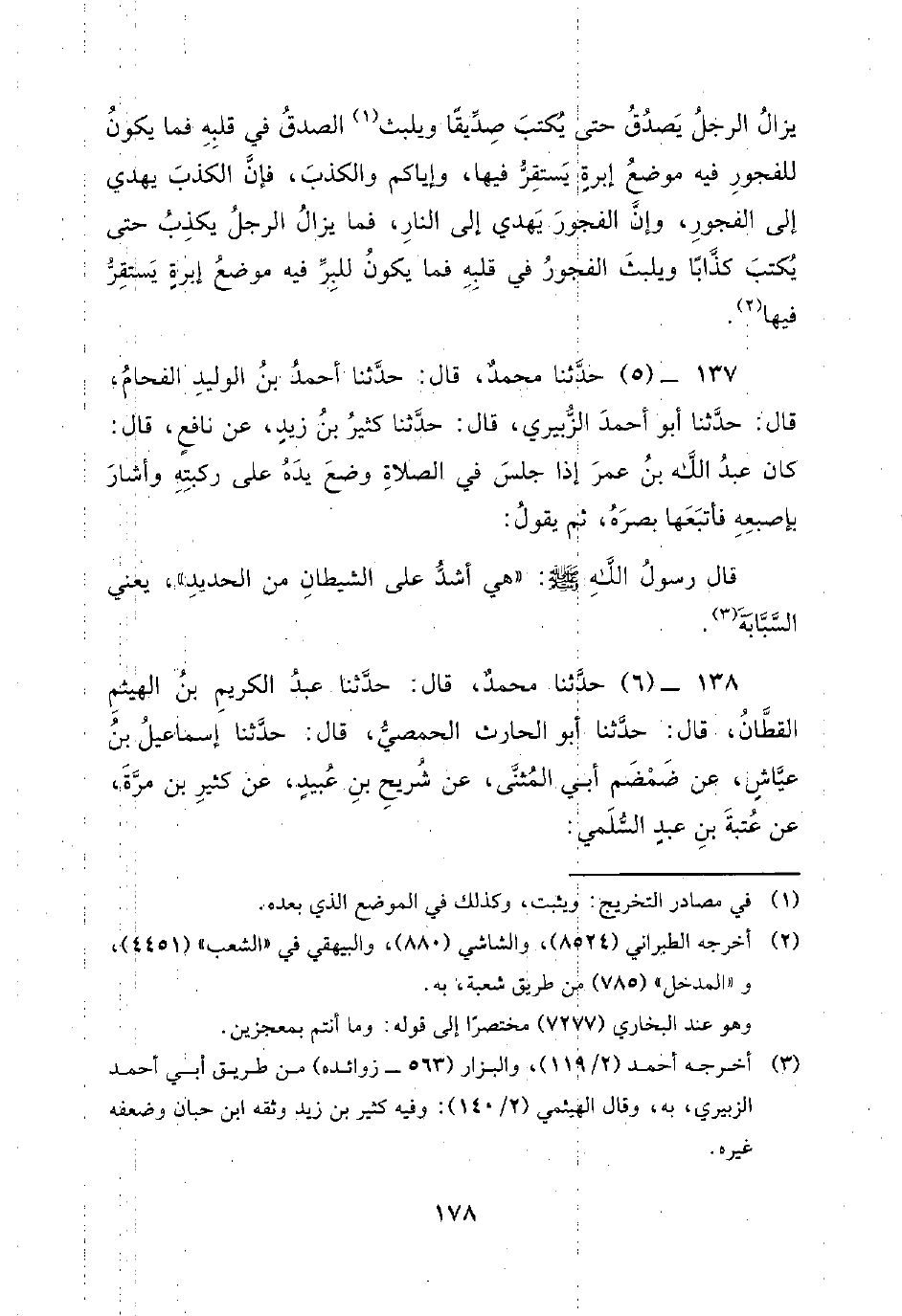 137 - (5) حدثنا محمد، قال: حدثنا أحمد بن الوليد الْفَحَّامُ، قَالَ: حَدَّثَنَا أَبُو أَحْمَدَ الزُّبَيْرِيُّ، قَالَ: حَدَّثَنَا كَثِيرُ بْنُ زَيْدٍ، عَنْ نَافِعٍ، قَالَ: كَانَ عَبْدُ اللَّهِ بْنُ عُمَرَ إِذَا جَلَسَ فِي الصَّلاةِ وَضَعَ يَدَهُ عَلَى رُكْبَتِهِ وَأَشَارَ بِإِصْبَعِهِ فَأَتْبَعَهَا بَصَرَهُ، ثُمَّ يَقُولُ: قَالَ رَسُولُ اللَّهِ صَلَّى اللَّهُ عَلَيْهِ وَسَلَّمَ: هِيَ أَشَدُّ عَلَى الشَّيْطَانِ مِنَ الحديد، يعني السبابة.