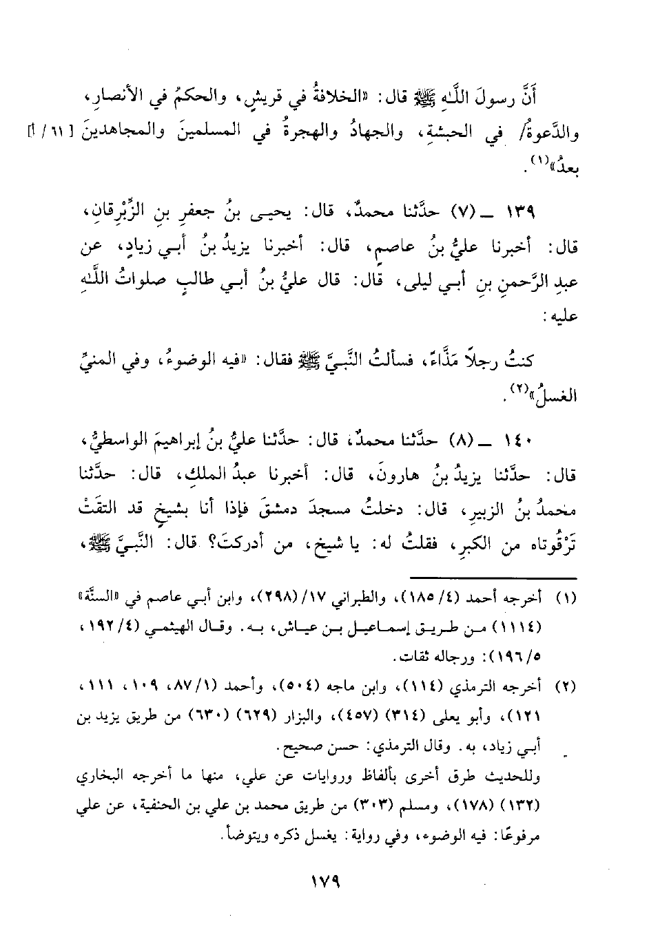 139 - (7) حدثنا محمد، قال: يَحْيَى بْنُ جَعْفَرِ بْنِ الزِّبْرِقَانِ، قَالَ: أَخْبَرَنَا عَلِيُّ بْنُ عَاصِمٍ، قَالَ: أَخْبَرَنَا يَزِيدُ بْنُ أَبِي زِيَادٍ، عَنْ عَبْدِ الرَّحْمَنِ بْنِ أَبِي لَيْلَى، قَالَ: قَالَ عَلِيُّ بْنُ أَبِي طَالِبٍ صَلَوَاتُ اللَّهِ عَلَيْهِ: كُنْتُ رَجُلا مَذَّاءً، فَسَأَلْتُ النَّبِيَّ صَلَّى اللَّهُ عَلَيْهِ وَسَلَّمَ فَقَالَ: فِيهِ الوضوء، وفي المني الغسل.