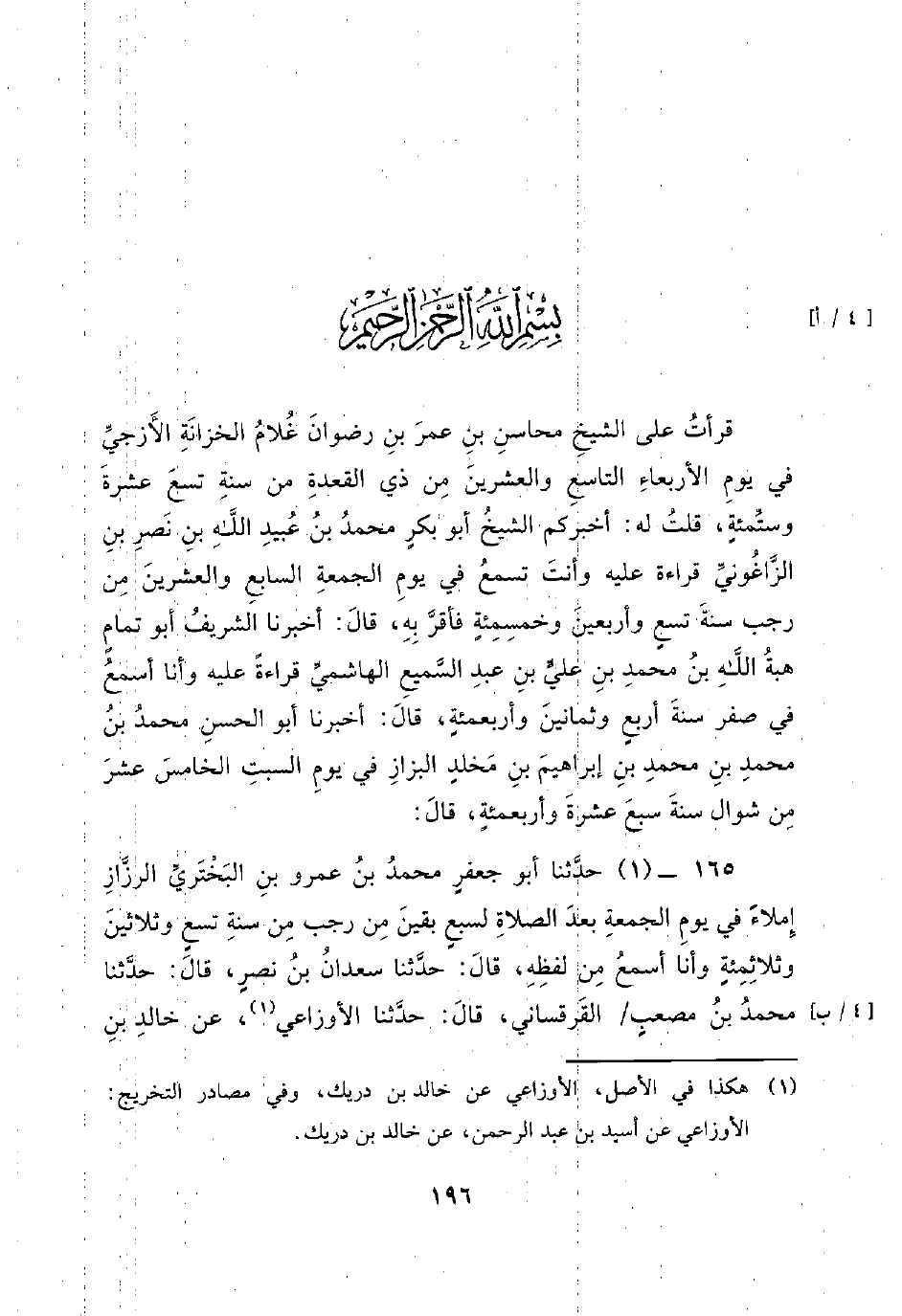 قرأت على الشيخ محاسن بن عمر بن رضوان غلام الخزانة الأزجي في يوم الأربعاء التاسع والعشرين من ذي القعدة من سنة تسع عشرة وستمئة، قلت له: أخبركم الشيخ أبو بكر محمد بن عبيد الله بن نصر بن الزاغوني قراءة عليه وأنت تسمع في يوم الجمعة السابع والعشرين من رجب سنة تسع وأربعين وخمسمئة فأقر به، قال: أخبرنا الشريف أبو تمام هبة الله بن محمد بن علي بن عبد السميع الهاشمي قراءة عليه وأنا أسمع في صفر سنة أربع وثمانين وأربعمئة، قال: أَخْبَرَنَا أَبُو الْحَسَنِ مُحَمَّدُ بْنُ مُحَمَّدِ بن محمد بن إبراهيم بن مخلد البزاز في يوم السبت الخامس عشر من شوال سنة سبع عشرة وأربعمئة، قَالَ: