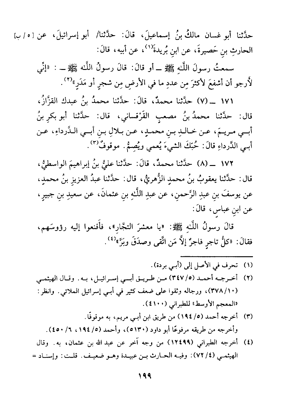 172 - (8) حدثنا محمد، قال: حدثنا علي بن إبراهيم الْوَاسِطِيُّ، قَالَ: حَدَّثَنَا يَعْقُوبُ بْنُ مُحَمَّدٍ الزُّهْرِيُّ، قَالَ: حَدَّثَنَا عَبْدُ الْعَزِيزِ بْنُ مُحَمَّدٍ، عَنْ يُوسُفَ بْنِ عَبْدِ الرَّحْمَنِ، عَنْ عَبْدِ اللَّهِ بْنِ عُثْمَانَ، عَنْ سَعِيدِ بْنِ جُبَيْرٍ، عَنِ ابْنِ عَبَّاسٍ، قَالَ: قَالَ رَسُولُ اللَّهِ صَلَّى اللَّهُ عَلَيْهِ وَسَلَّمَ: يا معشر التجار، فأقنعوا إليه رؤوسهم، فَقَالَ: كُلُّ تَاجِرٍ فَاجِرٌ إِلا مَنِ اتَّقَى وصدق وبر.