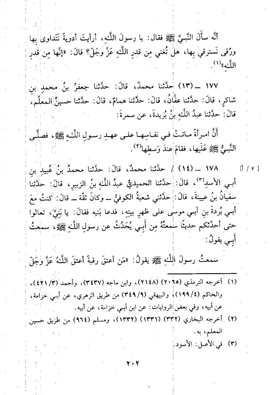 177 - (13) حدثنا محمد، قال: حَدَّثَنَا جَعْفَرُ بْنُ مُحَمَّدِ بْنِ شَاكِرٍ، قَالَ: حَدَّثَنَا عَفَّانُ، قَالَ: حَدَّثَنَا هَمَّامٌ، قَالَ: حَدَّثَنَا حُسَيْنُ الْمُعَلِّمُ، قَالَ: حَدَّثَنَا عَبْدُ اللَّهِ بْنُ بُرَيْدَةَ، عَنْ سَمُرَةَ: أَنَّ امْرَأَةً مَاتَتْ فِي نِفَاسِهَا عَلَى عَهْدِ رَسُولِ اللَّهِ صَلَّى اللَّهُ عَلَيْهِ وَسَلَّمَ، فَصَلَّى النَّبِيُّ صَلَّى اللَّهُ عَلَيْهِ وَسَلَّمَ عَلَيْهَا، فَقَامَ عِنْدَ وسطها.