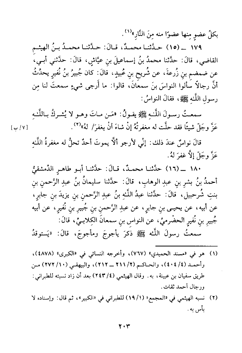 180 - (16) حدثنا محمد، قال: حَدَّثَنَا أَبُو طَاهِرٍ الدِّمَشْقِيُّ أَحْمَدُ بْنُ بِشْرِ بْنِ عَبْدِ الْوَهَّابِ، قَالَ: حَدَّثَنَا سُلَيْمَانُ بْنُ عَبْدِ الرَّحْمَنِ بْنِ بِنْتِ شُرَحْبِيلَ، قَالَ: حَدَّثَنَا عَبْدُ اللَّهِ بْنُ عَبْدِ الرَّحْمَنِ بْنِ يَزِيدَ بْنِ جَابِرٍ، عَنْ أَبِيهِ، عَنْ يَحْيَى بْنِ جَابِرٍ، عَنْ عَبْدِ الرَّحْمَنِ بْنِ جُبَيْرِ بْنِ نُفَيْرٍ، عَنْ أَبِيهِ جُبَيْرِ بْنِ نُفَيْرٍ الْحَضْرَمِيِّ، عَنِ النُّوَّاسِ بْنِ سَمْعَانَ الْكِلابِيِّ، قَالَ: سَمِعْتُ رَسُولَ اللَّهِ صَلَّى اللَّهُ عَلَيْهِ وَسَلَّمَ ذَكَرَ يَأْجُوجَ وَمَأْجُوجَ، قَالَ: يَسْتَوْقِدُ -[204]- الْمُسْلِمُونَ مِنْ جِعَابِهِمْ وَنِشَابِهِمْ وَتِرَاسِهِمْ وَقِسِيِّهِمْ سَبْعَ سنين.