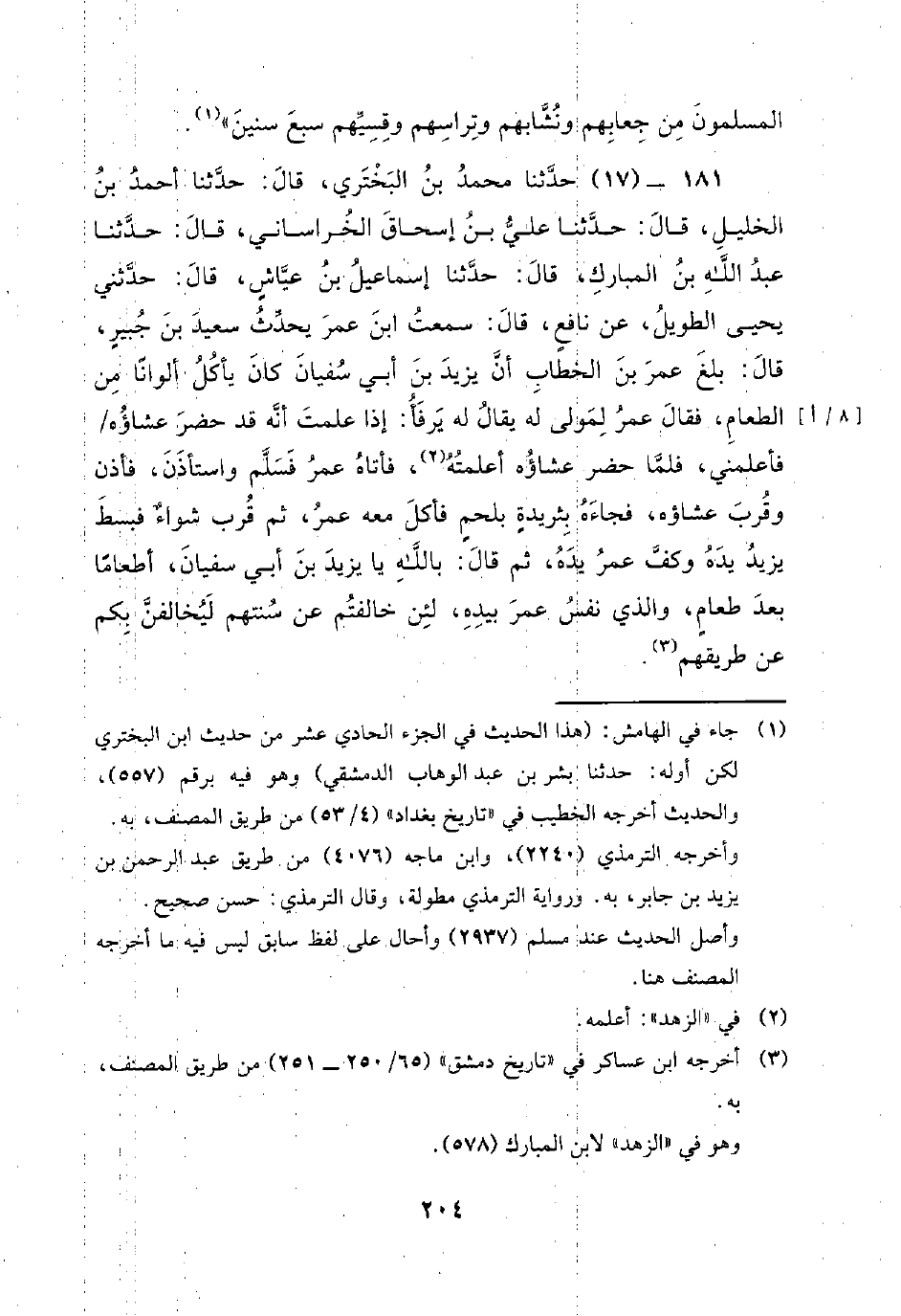 181 - (17) حدثنا محمد بن البختري، قال: حَدَّثَنَا أَحْمَدُ بْنُ الْخَلِيلِ، قَالَ: حَدَّثَنَا عَلِيُّ بْنُ إِسْحَاقَ الْخُرَاسَانِيُّ، قَالَ: حَدَّثَنَا عَبْدُ اللَّهِ بْنُ الْمُبَارَكِ، قَالَ: حَدَّثَنَا إِسْمَاعِيلُ بْنُ عَيَّاشٍ، قَالَ: حَدَّثَنِي يَحْيَى الطَّويِلُ، عَنْ نَافِعٍ، قَالَ: سَمِعْتُ ابْنَ عُمَرَ يُحَدِّثُ سَعِيدَ بْنَ جُبَيْرٍ، قَالَ: بَلَغَ عُمَرَ بْنَ الْخَطَّابِ أَنَّ يَزِيدَ بْنَ أَبِي سُفْيَانَ كَانَ يَأْكُلُ أَلْوَانًا مِنَ الطَّعَامِ، فَقَالَ عُمَرُ لِمَوْلًى لَهُ يُقَالُ لَهُ يَرْفَأُ: إِذَا عَلِمْتَ أَنَّهُ قَدْ حَضَرَ عَشَاؤُهُ / فَأَعْلِمْنِي، فَلَمَّا حَضَرَ عَشَاؤُهُ أَعْلَمْتُهُ، فَأَتَاهُ عُمَرُ فَسَلَّمَ وَاسْتَأْذَنَ، فَأَذِنَ وَقُرِّبَ عَشَاؤُهُ، فَجَاءَهُ بِثَرِيدَةٍ بلحم فأكل معه عمر، ثم قرب شواء فَبَسَطَ يَزِيدُ يَدَهُ وَكَفَّ عُمَرُ يَدَهُ، ثُمَّ قَالَ: بِاللَّهِ يَا يَزِيدُ بْنَ أَبِي سُفْيَانَ، أَطَعَامًا بَعْدَ طَعَامٍ، وَالَّذِي نَفْسُ عُمَرَ بِيَدِهِ، لَئِنْ خَالَفْتُمْ عَنْ سُنَّتِهِمْ لَيُخَالَفَنَّ بِكُمْ عَنْ طريقهم.
