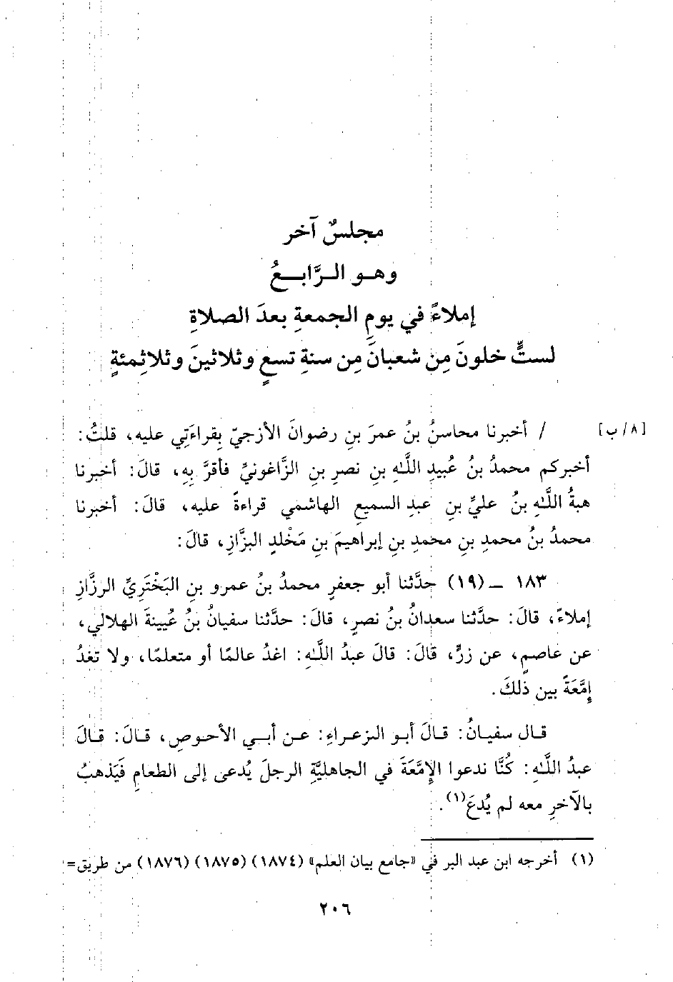 183 - (19) حَدَّثَنَا أَبُو جَعْفَرٍ مُحَمَّدُ بن عمرو بن البختري الرزاز إملاء، قال: حَدَّثَنَا سَعْدَانُ بْنُ نَصْرٍ، قَالَ: حَدَّثَنَا سُفْيَانُ بْنُ عُيَيْنَةَ الْهِلالِيُّ، عَنْ عَاصِمٍ، عَنْ زِرٍّ، قَالَ: قَالَ عَبْدُ اللَّهِ: اغْدُ عَالِمًا أَوْ مُتَعَلِّمًا، وَلا تَغْدُ إِمَّعَةُ بَيْنَ ذَلِكَ. قَالَ سُفْيَانُ: قَالَ أَبُو الزَّعْرَاءِ: عَنْ أَبِي الأَحْوَصِ، قَالَ: قَالَ عَبْدُ اللَّهِ: كُنَّا نَدْعُو الإِمَّعَةَ فِي الْجَاهِلِيَّةِ الرَّجُلُ يُدْعَى إِلَى الطَّعَامِ فَيَذْهَبُ بالآخر معه لم يدع.