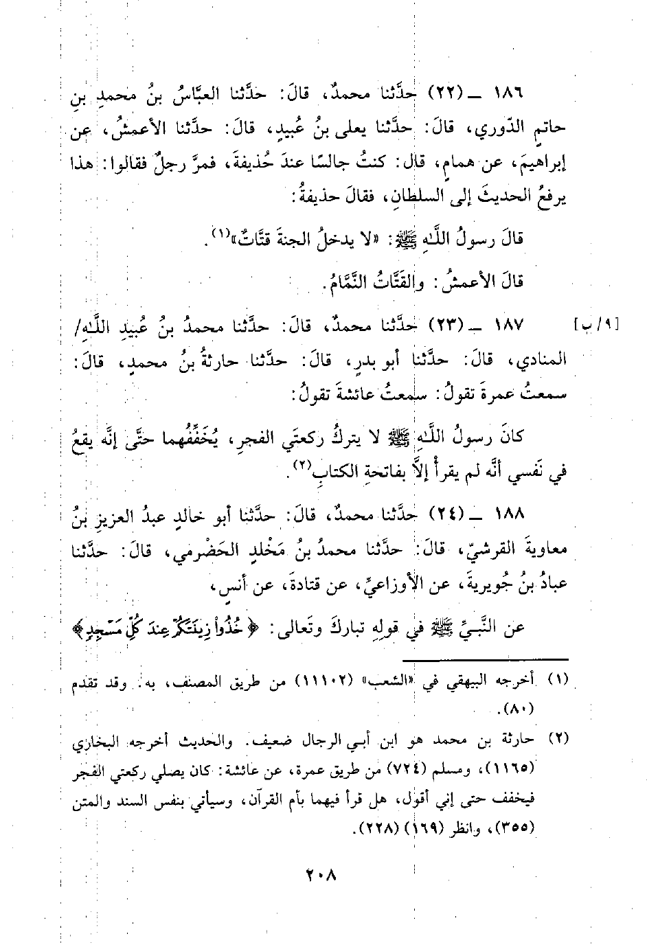 186 - (22) حدثنا محمد، قال: حدثنا العباس بن محمد بْنِ حَاتِمٍ الدُّورِيُّ، قَالَ: حَدَّثَنَا يَعْلَى بْنُ عُبَيْدٍ، قَالَ: حَدَّثَنَا الأَعْمَشُ، عَنْ إِبْرَاهِيمَ، عَنْ هَمَّامٍ، قَالَ: كُنْتُ جَالِسًا عِنْدَ حُذَيْفَةَ، فَمَرَّ رَجُلٌ فَقَالُوا: هَذَا يَرْفَعُ الْحَدِيثَ إِلَى السُّلْطَانِ، فَقَالَ حُذَيْفَةُ: قَالَ رَسُولُ اللَّهِ صَلَّى اللَّهُ عَلَيْهِ وَسَلَّمَ: لا يَدْخُلُ الْجَنَّةَ قَتَّاتٌ. قَالَ الأَعْمَشُ: وَالْقَتَّاتُ النَّمَّامُ.
