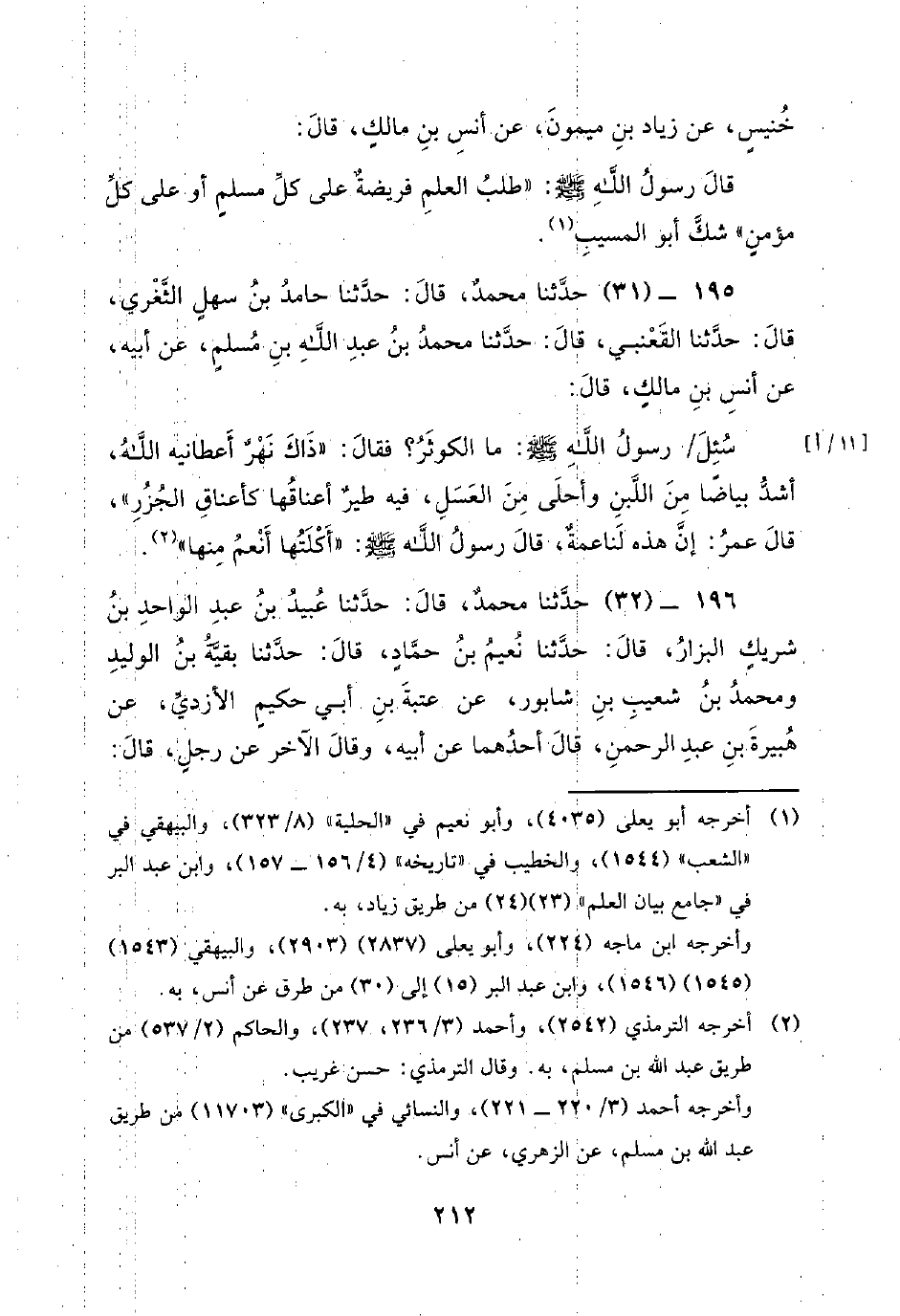 196 - (32) حدثنا محمد، قال: حَدَّثَنَا عُبَيْدُ بْنُ عَبْدِ الْوَاحِدِ بْنِ شَرِيكٍ الْبَزَّارُ، قَالَ: حَدَّثَنَا نُعَيْمُ بْنُ حَمَّادٍ، قَالَ: حَدَّثَنَا بَقْيَةُ بْنُ الْوَلِيدِ وَمُحَمَّدُ بْنُ شُعَيْبِ بْنِ شَابُورٍ، عَنْ عُتْبَةَ بْنِ أَبِي حَكِيمٍ الأَزْدِيِّ، عَنْ هُبَيْرَةَ بْنِ عَبْدِ الرَّحْمَنِ، قَالَ أَحَدُهُمَا عَنْ أَبِيهِ، وَقَالَ الآخَرُ عَنْ رَجُلٍ، قال: -[213]- كنا إذا أتينا أنس بْنُ مَالِكٍ وَكَثَّرْنَا عَلَيْهِ أَخْرَجَ إِلَيْنَا مَجَالٌ مِنْ كُتُبٍ فَقَالَ: هَذِهِ كُتُبٌ سَمِعْتُهَا مِنْ رسول الله صلى الله عليه وسلم وقرأناها عليه.