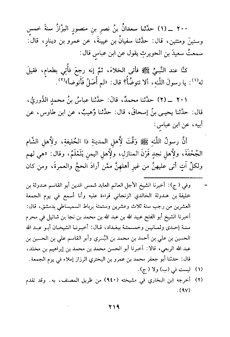 200 - (1) حدثنا سعدان بن نصر بن منصور البزاز سنة خمس وستين ومئتين، قَالَ: حَدَّثَنَا سُفْيَانُ بْنُ عُيَيْنَةَ، عَنْ عَمْرِو بْنِ دِينَارٍ، قَالَ: سمعت سعيد بن الحويرث يقول عن ابن عَبَّاسٍ قَالَ: كُنَّا عِنْدَ النَّبِيِّ صَلَّى اللَّهُ عَلَيْهِ وَسَلَّمَ فَأَتَى الْخَلاءَ، ثُمَّ إِنَّهُ رَجَعَ فَأَتَى بِطَعَامٍ، فَقِيلَ: يَا رَسُولَ اللَّهِ، أَلا تَتَوَضَّأُ؟ قَالَ: لَمْ أُصَلِّ فَأَتَوَضَّأَ.