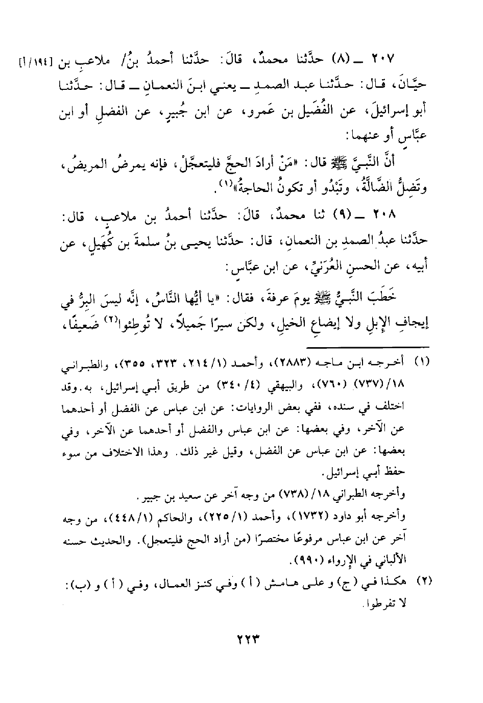 208 - (9) ثنا محمد، قال: حَدَّثَنَا أَحْمَدُ بْنُ مُلاعِبٍ، قَالَ: حَدَّثَنَا عَبْدُ الصَّمَدِ بْنُ النُّعْمَانِ، قَالَ: حَدَّثَنَا يَحْيَى بْنُ سَلَمَةَ بْنِ كُهَيْلٍ، عَنْ أَبِيهِ، عَنِ الْحَسَنِ الْعُرَنِيِّ، عَنِ ابْنِ عَبَّاسٍ: خَطَبَ النَّبِيُّ صَلَّى اللَّهُ عَلَيْهِ وَسَلَّمَ يَوْمَ عَرَفَةَ، فَقَالَ: يَا أَيُّهَا النَّاسُ، إِنَّهُ لَيْسَ الْبِرَّ فِي إِيجَافِ الإِبِلِ وَلا إِيضَاعِ الْخَيْلِ، ولكن سيرا جميلا، لا توطئوا ضعيفا، -[224]- ولا تؤذوا مسلما.