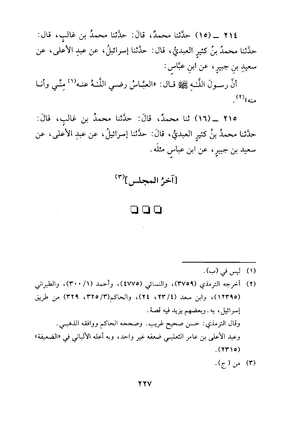 214 - (15) حدثنا محمد، قال: حدثنا محمد بن غالب، قَالَ: حَدَّثَنَا مُحَمَّدُ بْنُ كَثِيرٍ الْعَبْدِيُّ، قَالَ: حَدَّثَنَا إِسْرَائِيلُ، عَنْ عَبْدِ الأَعْلَى، عَنْ سَعِيدِ بْنِ جُبَيْرٍ، عَنِ ابْنِ عَبَّاسٍ: أَنَّ رَسُولَ اللَّهِ صَلَّى اللَّهُ عَلَيْهِ وَسَلَّمَ قَالَ: الْعَبَّاسُ رضي الله عنه مني وأنا منه.