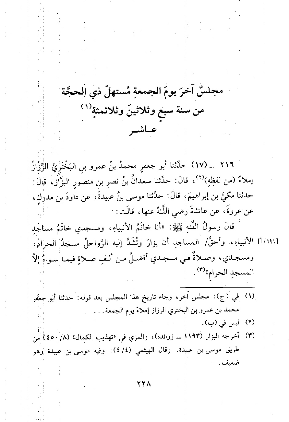 216 - (17) حَدَّثَنَا أبو جعفر محمد بن عمرو بن البختري الرَّزَّازِ إملاء مِنْ لَفْظِهِ، قَالَ: حَدَّثَنَا سَعْدَانُ بن نصر بن منصور البزاز، قال: حدثنا مَكِّيُّ بْنُ إِبْرَاهِيمُ، قَالَ: حَدَّثَنَا موسى بن عبيدة، عن دَاوُدَ بْنِ مُدْرِكٍ، عَنْ عُرْوَةَ، عَنْ عَائِشَةَ رَضِيَ اللَّهُ عَنْهَا، قَالَتْ: قَالَ رَسُولُ اللَّهِ صَلَّى اللَّهُ عَلَيْهِ وَسَلَّمَ: أَنَا خَاتَمُ الأَنْبِيَاءِ، وَمَسْجِدِي خَاتَمُ مَسَاجِدِ الأَنْبِيَاءِ، وَأَحَقُّ / الْمَسَاجِدِ أَنْ يُزَارَ وَتُشَدَّ إِلَيْهِ الرَّوَاحِلُ مَسْجِدُ الْحَرَامِ، وَمَسْجِدِي، وَصَلاةٌ فِي مَسْجِدِي أَفْضَلُ مِنْ أَلْفِ صَلاةٍ فِيمَا سِوَاهُ إِلا الْمَسْجِدَ الْحَرَامَ.