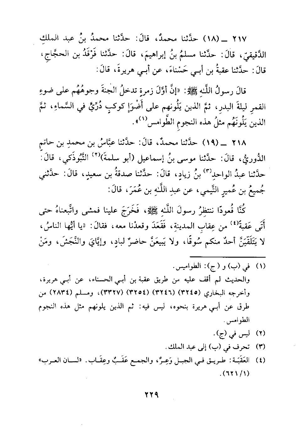 217 - (18) حدثنا محمد، قال: حدثنا محمد بن عبد الْمَلِكِ الدَّقِيقِيُّ، قَالَ: حَدَّثَنَا مُسْلِمُ بْنُ إِبْرَاهِيمَ، قَالَ: حَدَّثَنَا فَرْقَدُ بْنُ الْحَجَّاجُ، قَالَ: حَدَّثَنَا عُقْبَةُ بْنُ أَبِي حَسْنَاءَ، عَنْ أَبِي هُرَيْرَةَ، قَالَ: قَالَ رَسُولُ اللَّهِ صَلَّى اللَّهُ عَلَيْهِ وَسَلَّمَ: إِنَّ أَوَّلَ زُمْرَةٍ تَدْخُلُ الْجَنَّةَ وُجُوهُهُمْ عَلَى ضَوْءِ الْقَمَرِ لَيْلَةَ الْبَدْرِ، ثُمَّ الَّذِينَ يلونهم على أضوء كَوْكَبٍ دُرِّيٍّ فِي السَّمَاءِ، ثُمَّ الَّذِينَ يَلُونَهُمْ مثل هذه النجوم الطوامس.