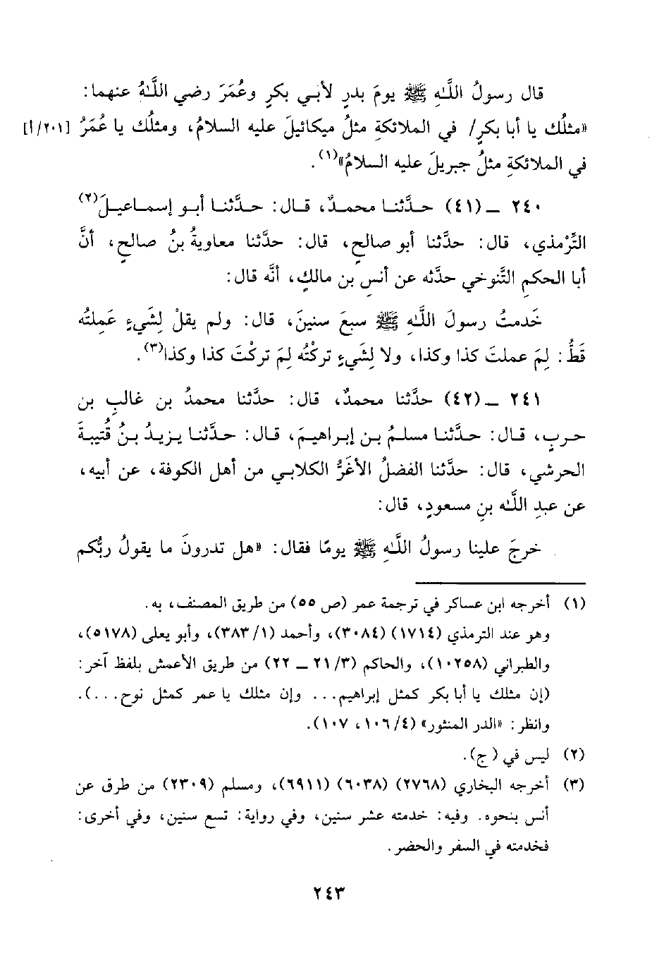 240 - (41) حَدَّثَنَا محمد، قال: حَدَّثَنَا أَبُو إِسْمَاعِيلَ التِّرْمِذِيُّ، قَالَ: حَدَّثَنَا أَبُو صَالِحٍ، قَالَ: حَدَّثَنَا مُعَاوِيَةُ بْنُ صَالِحٍ، أَنَّ أَبَا الْحَكَمِ التَّنُوخِيَّ حَدَّثَهُ عَنْ أَنَسِ بْنِ مَالِكٍ، أَنَّهُ قَالَ: خَدَمْتُ رَسُولِ اللَّهِ صَلَّى اللَّهُ عَلَيْهِ وَسَلَّمَ سَبْعَ سِنِينَ، قَالَ: وَلَمْ يَقُلْ لِشَيْءٍ عَمِلْتُهُ قَطُّ: لِمَ عَمِلْتَ كَذَا وَكَذَا، وَلا لِشَيْءٍ تَرَكْتُهُ لِمَ تَرَكْتَ كَذَا وكذا.
