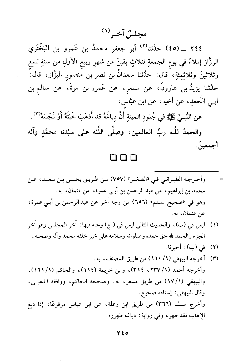 244 - (45) حَدَّثَنَا أَبُو جَعْفَرٍ مُحَمَّدُ بْنُ عمرو بن البختري الرزاز إملاء في يوم الجمعة لثلاث بقين من شهر ربيع الأول من سنة تسع وثلاثين وثلاثمائة، قال: حدثنا سعدان بن نصر بن منصور البزاز، قال: حَدَّثَنَا يَزِيدُ بْنُ هَارُونَ، عَنْ مِسْعَرٍ، عَنْ عَمْرِو بْنِ مُرَّةَ، عَنْ سَالِمِ بْنِ أَبِي الْجَعْدِ، عَنْ أَخِيهِ، عَنِ ابْنِ عَبَّاسٍ، عَنِ النَّبِيِّ صَلَّى اللَّهُ عَلَيْهِ وَسَلَّمَ فِي جُلُودِ الميتة أن دباغه قد أذهب بخبثه أو نجسه.