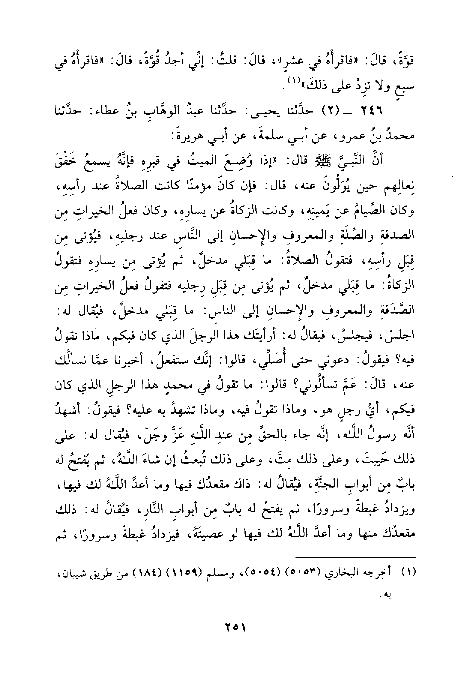 246 - (2) حَدَّثَنَا يَحْيَى: حَدَّثَنَا عَبْدُ الْوَهَّابِ بْنُ عَطَاءٍ: حَدَّثَنَا مُحَمَّدُ بْنُ عَمْرٍو، عَنْ أَبِي سَلَمَةَ، عَنْ أَبِي هُرَيْرَةَ: أَنَّ النَّبِيَّ صَلَّى اللَّهُ عَلَيْهِ وَسَلَّمَ قَالَ: إِذَا وُضِعَ الْمَيِّتُ فِي قَبْرِهِ فَإِنَّهُ يَسْمَعُ خَفْقَ نِعَالِهِمْ حِينَ يُوَلُّونَ عَنْهُ، قَالَ: فَإِنْ كَانَ مُؤْمِنًا كَانَتِ الصَّلاةُ عِنْدَ رَأْسِهِ، وَكَانَ الصِّيَامُ عَنْ يَمِينِهِ، وَكَانَتِ الزَّكَاةُ عَنْ يَسَارِهِ، وَكَانَ فِعْلُ الْخَيْرَاتِ مِنَ الصَّدَقَةِ وَالصِّلَةِ وَالْمَعْرُوفِ وَالإِحْسَانِ إِلَى النَّاسِ عِنْدَ رِجْلَيْهِ، فَيُؤْتَى مِنْ قِبَلِ رَأْسِهِ، فَتَقُولُ الصَّلاةُ: مَا قِبَلِي مَدْخَلٌ، ثُمَّ يُؤْتَى مِنْ يَسَارِهِ فَتَقُولُ الزَّكَاةُ: مَا قِبَلِي مَدْخَلٍ، ثُمَّ يُؤْتَى مِنْ قِبَلِ رِجْلَيْهِ فَتَقُولُ فِعْلُ الْخَيْرَاتِ مِنَ الصَّدَقَةِ وَالْمَعْرُوفِ وَالإِحْسَانِ إِلَى النَّاسِ: مَا قِبَلِي مَدْخَلٌ، فَيُقَالُ لَهُ: اجْلِسْ، فَيَجْلِسُ، فَيُقَالُ لَهُ: أَرَأَيْتُكَ هَذَا الرَّجُلَ الَّذِي كَانَ فِيكُمْ، مَاذَا تَقُولُ فِيهِ؟ فَيَقُولُ: دَعُونِي حَتَّى أُصَلِّيَ، قَالُوا: إِنَّكَ سَتَفْعَلُ، أَخْبِرْنَا عَمَّا نَسْأَلُكَ عَنْهُ، قَالَ: عَمَّ تَسْأَلُونِي؟ قَالُوا: مَا تَقُولُ فِي مُحَمَّدٍ هَذَا الرَّجُلُ الَّذِي كَانَ فِيكُمْ، أَيُّ رَجُلٍ هُوَ، وَمَاذَا تَقُولُ فِيهِ، وَمَاذَا تَشْهَدُ بِهِ عَلَيْهِ؟ فَيَقُولُ: أَشْهَدُ أَنَّهُ رَسُولُ اللَّهِ، إِنَّهُ جَاءَ بِالْحَقِّ مِنْ عِنْدِ اللَّهِ عَزَّ وَجَلَّ، فَيُقَالُ لَهُ: عَلَى ذَلِكَ حَيِيتَ، وَعَلَى ذَلِكَ مِتَّ، وَعَلى ذَلِكَ تُبْعَثُ إِنْ شَاءَ اللَّهُ، ثُمَّ يُفْتَحُ لَهُ بَابٌ مِنْ أَبْوَابِ الْجَنَّةِ، فَيُقَالُ لَهُ: ذَاكَ مَقْعَدُكَ فِيهَا وَمَا أَعَدَّ اللَّهُ لَكَ فِيهَا، وَيَزْدَادُ غِبْطَةً وَسُرُورًا، ثُمَّ يُفْتَحُ لَهُ بَابٌ مِنْ أَبْوَابِ النَّارِ، فَيُقَالُ لَهُ: ذَلِكَ مَقْعَدُكَ مِنْهَا وَمَا أَعَدَّ اللَّهُ لَكَ فِيهَا لَوْ عَصَيْتَهُ، فَيَزْدَادُ غِبْطَةً وَسُرُورًا، ثُمَّ -[252]- يُفْسَحُ لَهُ فِي قَبْرِهِ / سَبْعُونَ ذِرَاعًا وينور له ويعاد الجسد كما بدئ، وَتُجْعَلُ نَسَمَتُهُ فِي النَّسَمِ الطَّيِّبَةِ، وَهُوَ طَيْرٌ يُعَلَّقُ فِي شَجَرِ الْجَنَّةِ فَسَمِعْتُ عُمَرَ بْنَ الْحَكَمِ بْنِ ثَوْبَانَ قَالَ: فَيَنَامُ نَوْمَةَ الْعَرُوسِ لا يُوقِظُهُ إِلا أَحَبُّ أَهْلِهِ إِلَيْهِ حَتَّى يَبْعَثَهُ اللَّهُ. قَالَ: عَادَ إِلَى حَدِيثِ أَبِي هُرَيْرَةَ -، قَالَ: فَقَالَ أَبُو هُرَيْرَةَ فِي حَدِيثِهِ فِي قَوْلِ الله تعالى: {يثبت الله الذين ءامنوا بِالْقَوْلِ الثَّابِتِ فِي الْحَيَاةِ الدُّنْيَا وَفِي الآخرة ويضل الله الظالمين}. قَالَ: فَإِنْ كَانَ كَافِرًا أُتِيَ مِنْ قِبَلِ رَأْسِهِ فَلَمْ يُوجَدْ شَيْءٌ، ثُمَّ أُتِيَ عَنْ يَمِينِهِ فَلَمْ يَرَ شَيْئًا، ثُمَّ أُتِيَ عَنْ يَسَارِهِ فَلَمْ يُوجَدْ شَيْءٌ، ثُمَّ أُتِيَ مِنْ قِبَلِ رِجْلَيْهِ فَلَمْ يُوجَدْ شَيْءٌ، فَيُقَالُ لَهُ: اجْلِسْ، فَيَجْلِسُ خَائِفًا مَرْعُوبًا، فَيُقَالُ لَهُ: مَا رَأْيُكَ فِي هَذَا الرَّجُلُ الَّذِي كَانَ فِيكُمْ، أَيُّ رَجُلٍ هُوَ، وَمَاذَا تَشْهَدُ لَهُ؟ فَيَقُولُ: أَيُّ رَجُلٍ؟ فَيُقَالُ: مُحَمَّدٌ صَلَّى اللَّهُ عَلَيْهِ وَسَلَّمَ، فَيَقُولُ: مَا أَدْرِي، سَمِعْتُ النَّاسَ قَالُوا قَوْلا فَقُلْتُ كَمَا قَالَ النَّاسُ، فَيُقَالُ: عَلَى ذَلِكَ حَيِيتَ وَعَلَى ذَلِكَ مِتَّ وَعَلى ذَلِكَ تُبْعَثُ إِنْ شَاءَ اللَّهُ، قَالَ: ثُمَّ يُفْتَحُ لَهُ بَابٌ مِنْ أَبْوَابِ النَّارِ فَيُقَالُ لَهُ: هَذَا مَقْعَدُكَ مِنَ النَّارِ وَمَا أَعَدَّ اللَّهُ لَكَ، فَيَزْدَادُ حَسْرَةً وَثُبُورً