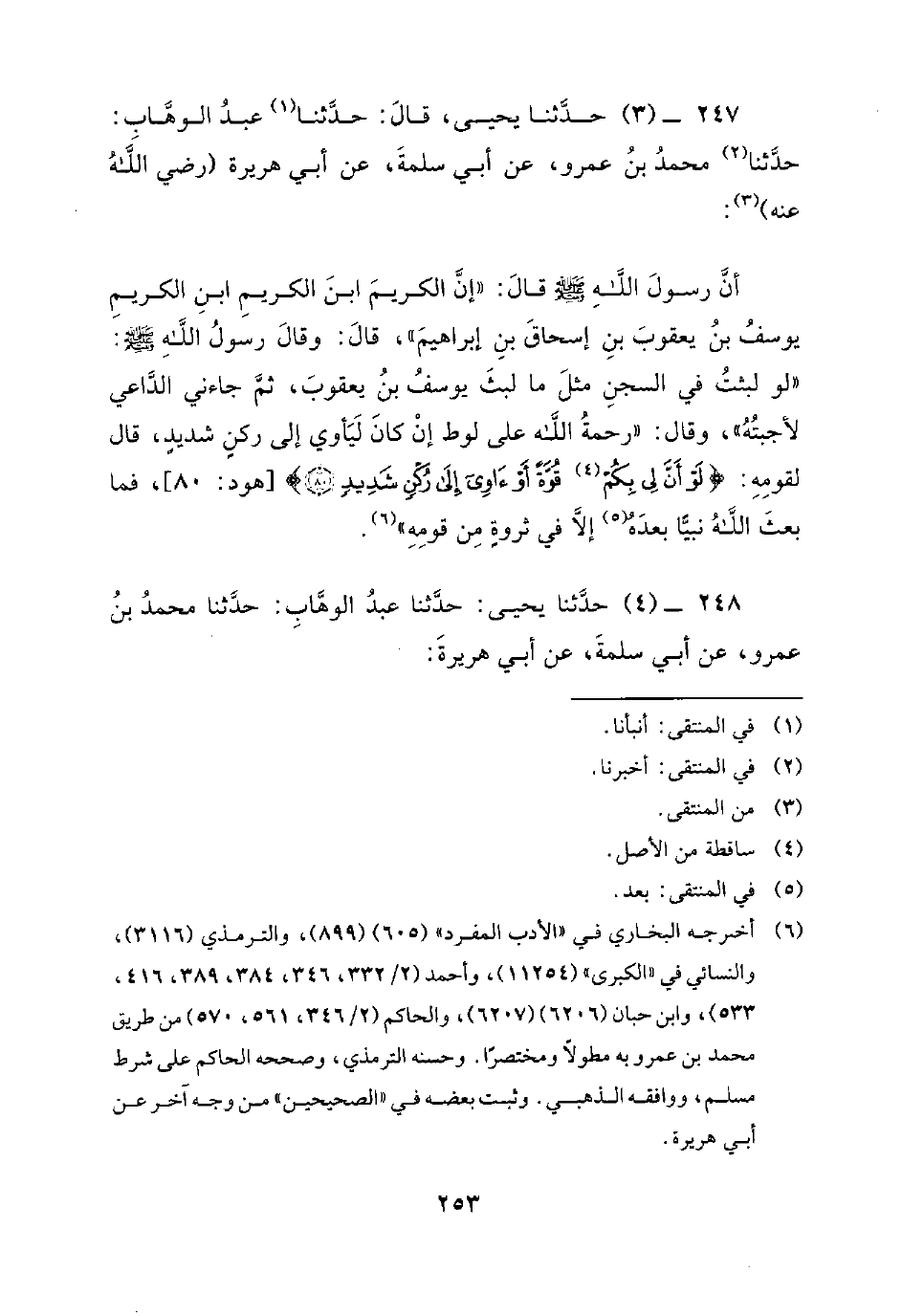 247 - (3) حدثنا يحيى، قال: حدثنا عبد الوهاب: أخبرنا مُحَمَّدُ بْنُ عَمْرٍو، عَنْ أَبِي سَلَمَةَ، عَنْ أَبِي هُرَيْرَةَ رَضِيَ اللَّهُ عَنْهُ: أَنَّ رَسُولَ اللَّهِ صَلَّى اللَّهُ عَلَيْهِ وَسَلَّمَ قَالَ: إِنَّ الْكَرِيمَ ابْنَ الْكَرِيمِ ابْنِ الْكَرِيمِ يُوسُفَ بْنَ يَعْقُوبَ بْنِ إِسْحَاقَ بْنِ إِبْرَاهِيمَ، قَالَ: وَقَالَ رَسُولُ اللَّهِ صَلَّى اللَّهُ عَلَيْهِ وَسَلَّمَ: لَوْ لَبِثْتُ فِي السِّجْنِ مِثْلَ مَا لَبِثَ يُوسُفُ بْنُ يَعْقُوبَ، ثُمَّ جَاءَنِي الدَّاعِي لأَجَبْتُهُ، وَقَالَ: رَحْمَةُ اللَّهِ عَلَى لُوطٍ إِنْ كَانَ لَيَأْوِي إِلَى رُكْنٍ شَدِيدٍ، قَالَ لِقَوْمِهِ: {لَوْ أَنَّ لي بكم قوة أو ءاوى إِلَى رُكْنٍ شديد}، فَمَا بَعَثَ اللَّهُ نَبِيًّا بَعْدَهُ إِلا فِي ثَرْوَةٍ مِنْ قَوْمِهِ.